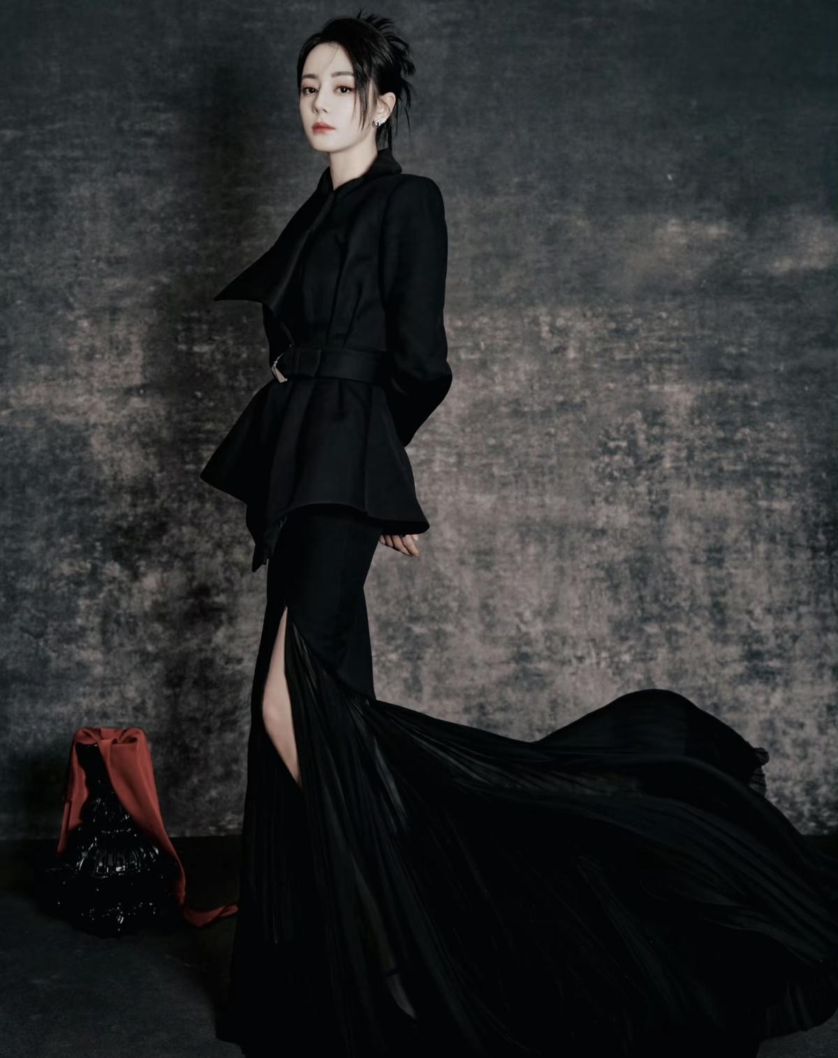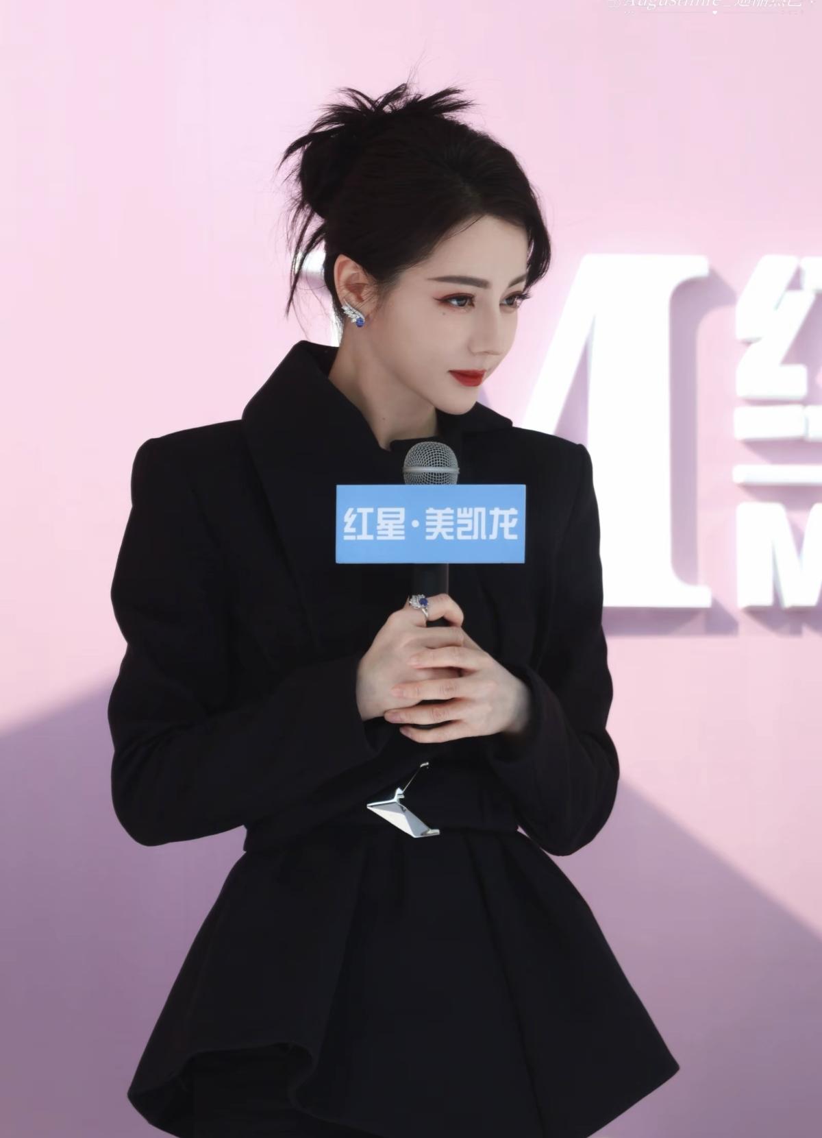 杨幂身着藏青色丝绒缎面拼接礼服亮相 大廓形露肩设计搭配奢华钻饰,尽显优雅大气的女