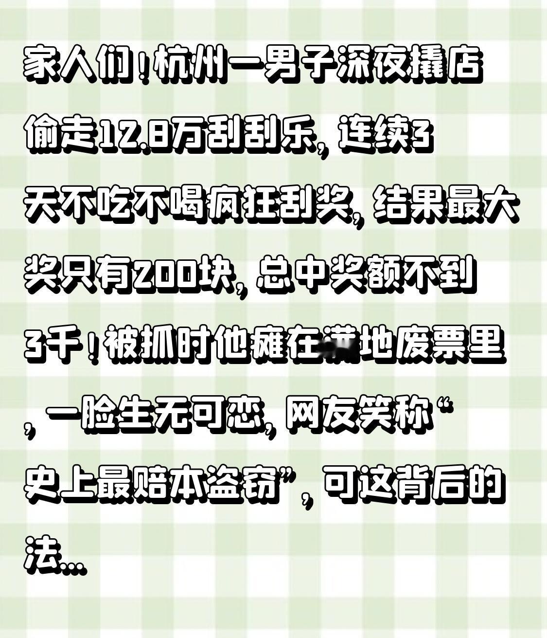 家人们!杭州一男子深夜撬店偷走12.8万刮刮乐,连续3天不吃不喝疯狂刮奖,结果最大奖只有200块,总中奖额不到3千!被抓时他瘫在满地废票里,一脸生无可恋,网友笑称“史上最赔本盗窃”,可这背后的法律后果和彩票真相,比剧情还刺激! 这事让店主都懵了!凌晨3点报警器响,早上开门发现保险箱被撬,6400张刮刮乐全没了,小到5元面值,大到50元高端票,损失直接上十万。监控里小偷裹着连帽衫,搬起彩票箱就跑,谁能想到他不是去兑奖,而是找了个出租屋“闭门刮奖”。 民警找上门时,场面堪称魔幻:地上、床上、沙发上全是刮开的废票,嫌疑人李某手指都磨出了茧,眼神呆滞得像丢了魂。他交代,自己欠了高利贷,听说“刮刮乐能一夜暴富”,就想赌一把,以为“数量够多总能中大奖”。可现实狠狠打脸——6400张刮完,中奖总额才2860元,连盗窃成本的零头都不够。 但转折点来了!别以为他没中大奖就不算犯罪,法律早就明确了:刮刮乐是“不记名有价凭证”,盗窃金额要按票面价+印制奖金总额算,哪怕没中奖,也按12.8万的“数额巨大”定罪!最终李某因盗窃罪被判3年有期徒刑,还得赔店主损失,真是偷鸡不成蚀把米,赔了自由又赔钱。 更扎心的是,他根本不懂刮刮乐的中奖概率:50元高端票中百万大奖的概率低至1/200万,比被雷击中还难13倍!财政部规定刮刮乐返奖率固定65%,但这是整个奖组的平均数据,不是花100元必中65元,有人实测1250元只中550元,回本率才44%。李某偷的6400张,本质就是在赌极小概率的运气,输是必然。 还有个致命误区:他以为偷来的彩票能兑奖,却不知道大额奖金不仅要实名登记,还得带身份证原件,超过1万还要去指定中心兑奖。就算他真中了百万大奖,拿着偷来的彩票去兑奖,一刷身份证就会露馅,照样逃不过法律制裁。 其实这不是孤例,江苏有人偷8万刮刮乐中1700元,广东有人偷5万刮完自首,都是被“一夜暴富”的幻想冲昏了头。他们忘了,彩票的本质是公益捐赠,不是致富捷径,靠盗窃博运气,更是把自己推向深渊。 这事也给所有人提了醒:一是购彩要理性,别把希望寄托在概率极低的彩票上,踏实赚钱才靠谱;二是守法是底线,再急着用钱也不能走歪路,否则轻则赔钱,重则坐牢;三是彩票店要做好防护,夜间把彩票锁进银行保险柜,避免被贼盯上。 生活里没有不劳而获的幸运,只有脚踏实地的安稳。与其抱着侥幸心理赌未来,不如一步一个脚印拼当下。评论区说说,你见过最离谱的“暴富梦”是什么?你买刮刮乐是图个乐还是真想买大奖?点赞转发,让更多人看清彩票真相,守住法律底线,愿大家都能靠努力收获想要的生活!