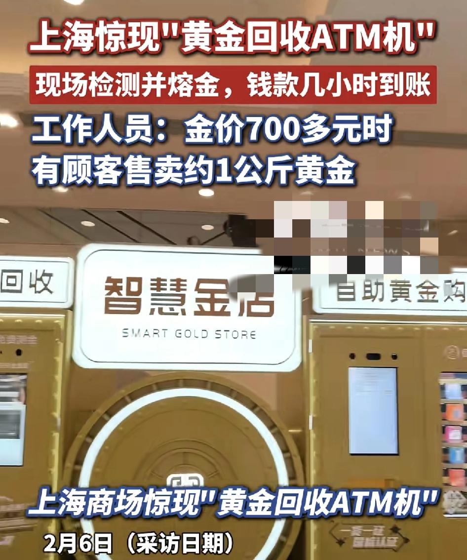 最近有网友发视频称上海商场出现了全球首台黄金回收atm机,消费者只需要把黄金放入机器里面,就可以看到机器自主操作,全程透明,还可以看到整个融金的过程。只要含金量百五十以上的都能回收,如果是镶嵌钻石或者是宝石的,只要提前分拆好就可以。首饰金收2.8%的服务费,金条收2%的服务费。前段时间金价1200多元的时候人流会多一点,现在经济下跌了,人流少一点。