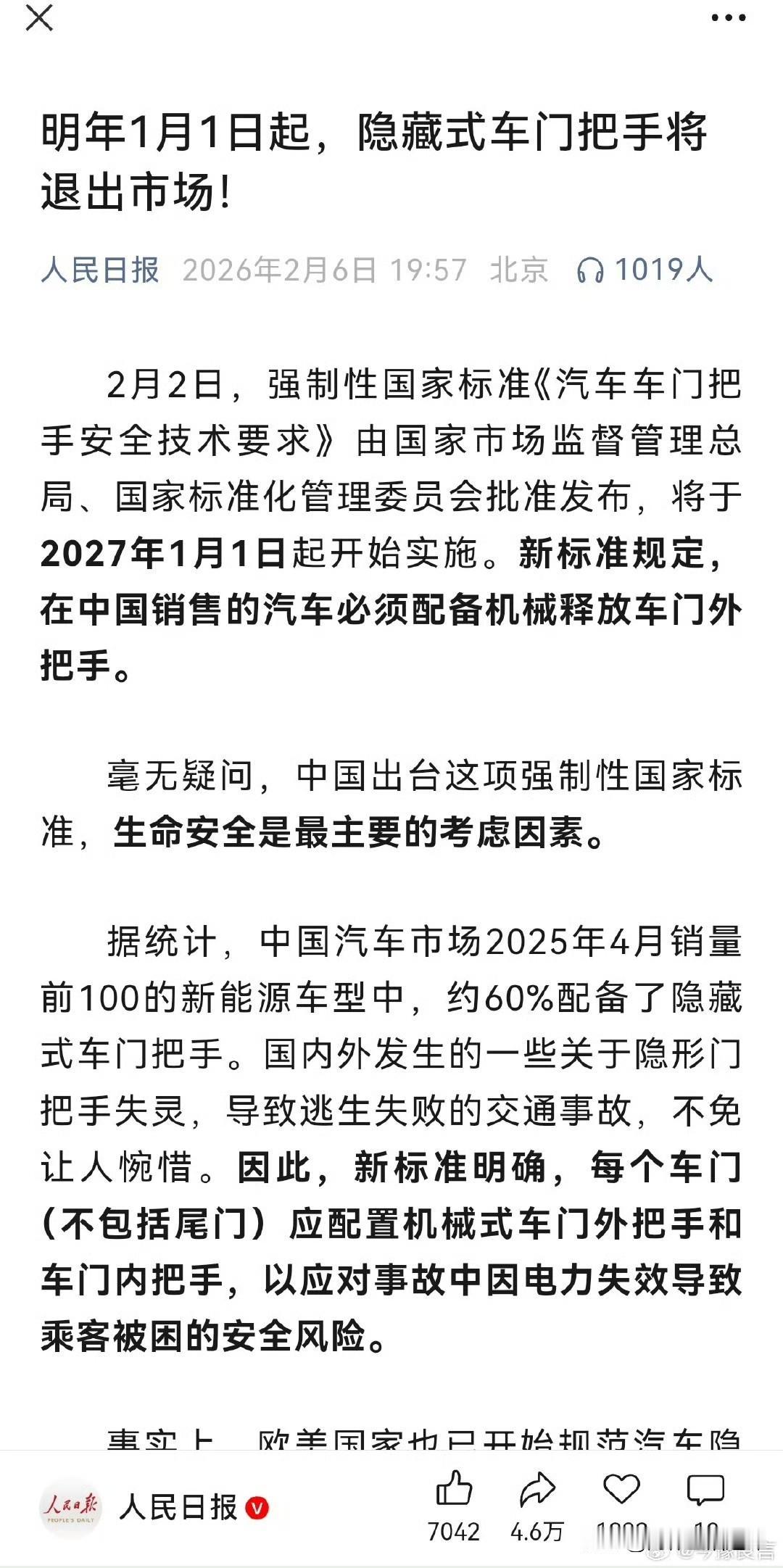 就在刚刚 工信部率先拉新能源汽车强制国标规定,从2027年1月起,我们将彻底告别汽车上的隐藏式门把手。 新国标规定所有车门必须配备机械式门把手,车外必须预留手动操作的空间 说实话 汽车隐藏式门把手刚一出现 我就觉得非常不实用,尤其在我们北方。 冬北方的冬天部分地区零下好几十度,遇到冻雨下雪天,急需开车办事,结果因冰冻天气车子门把手直接冻住出不来,这刻只能干着急,碰到救命的事,一秒都不能耽搁。 记得之前山西发生过一起新能源汽车起火事故,因电动门把手失效,导致救援进程被耽误,造成了悲剧。 说白了汽车本身就是人的代步工具,有些不必要的新科技新玩意,根本没必要一股脑儿往车上装。 造车企业只要把控车子质量、安全性能没问题,其他类似“多人工智能、显示屏幕大、智能驾驶”这些玩意,我觉得完全没必要给车上装。 记住,不管你车子有多炫酷的隐藏设计,都得留好“救命开关”,确保救援人员戴手套也能快速开门~ 要知道安全永远比颜值重要,为这个守护生命的新规点个赞👍 大家觉得这个标准执行下来,之前已购买隐藏式把手的汽车会不会被召回来整改?