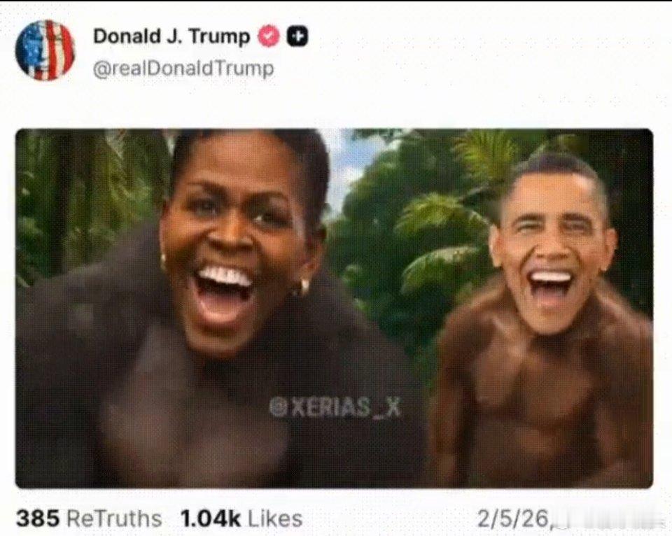 特朗普发视频把奥巴马夫妇P成猴子这是川普朴实无华的人身攻击吗?话说奥巴马夫妇被川普p成猴子,他们会不会起诉川普要赔偿?