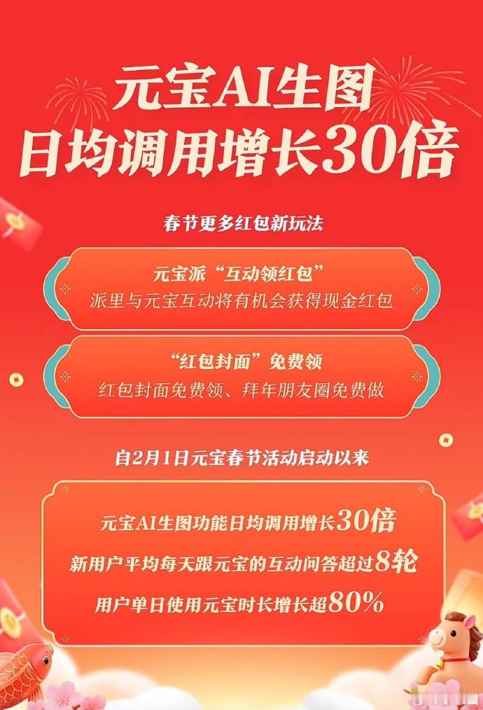 元宝AI生图增长30倍春节和元宝玩上瘾了?数据显示,AI生图调用暴涨30倍,新朋