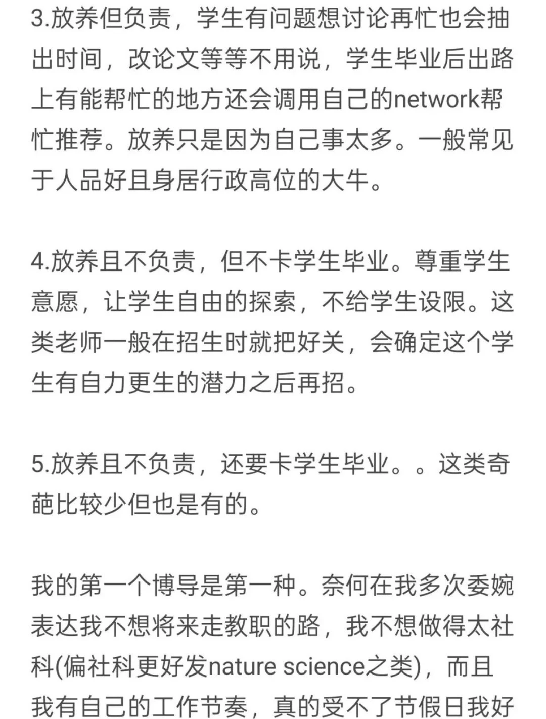 4.放养且不负责,但不卡学生毕业。尊重学生意愿,让学生自由的探索,不给学生设限。这类老师一般在招生时就把好关,会确定这个学生有自力更生的潜力之后再招。