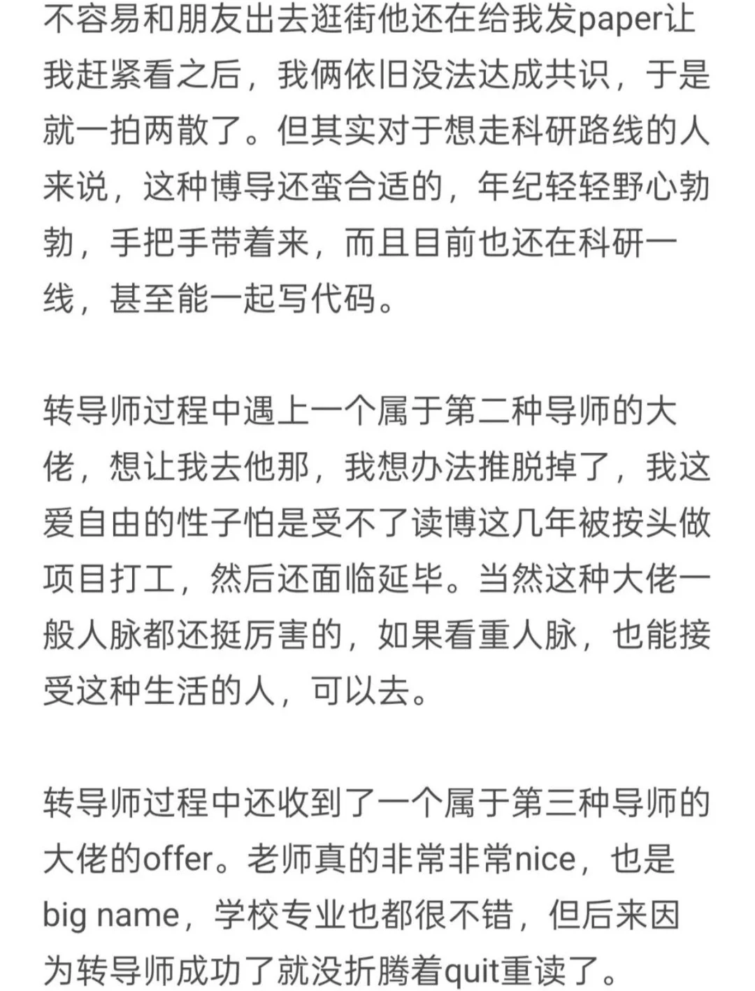 转导师过程中还收到了一个属于第三种导师的大佬的offer。老师真的非常非常nice,也是big name,学校专业也都很不错,但后来因为转导师成功了就没折腾着quit重读了