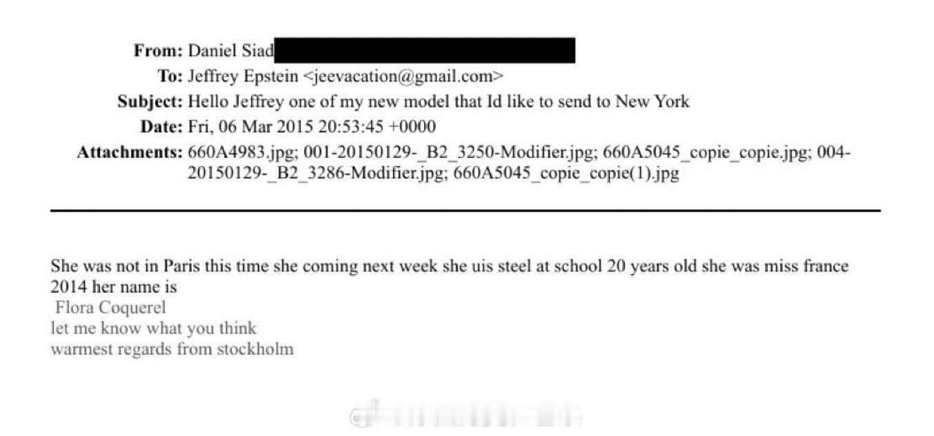 海外新鲜事 2014 年法国小姐 Flora Coquerel 被杰弗里·爱泼斯坦的一名“招募女孩”的人员在文件中提及:“她还在上学,20 岁,是 2014 年法国小姐。她叫 Flora Coquerel。告诉我你们的看法。”(爱泼斯坦文件)爱泼斯坦爱泼斯坦死亡当晚监控曝光