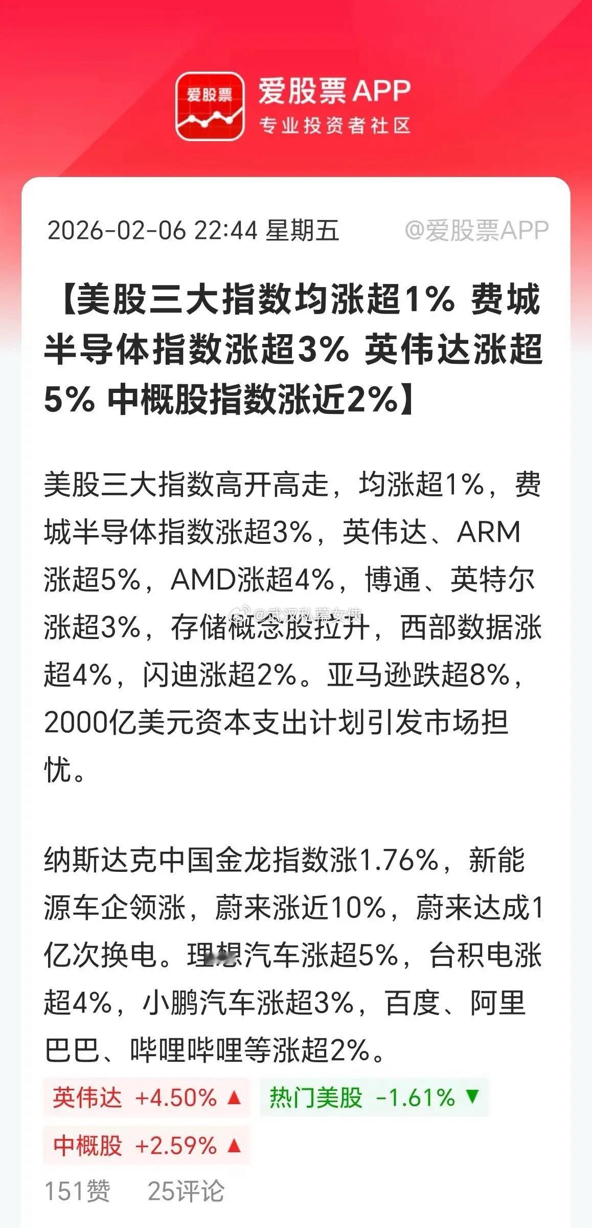 今晚美股全线反攻了,英伟达大涨5%,还得是达子啊。中概股、A50也都在爆拉。中概股指数大涨2%,A50涨近1%。看来外围恐慌要告一段落了,这是好事,有利于下周A股拿节前红包!你们说下周拿几个红包过年合适啊。