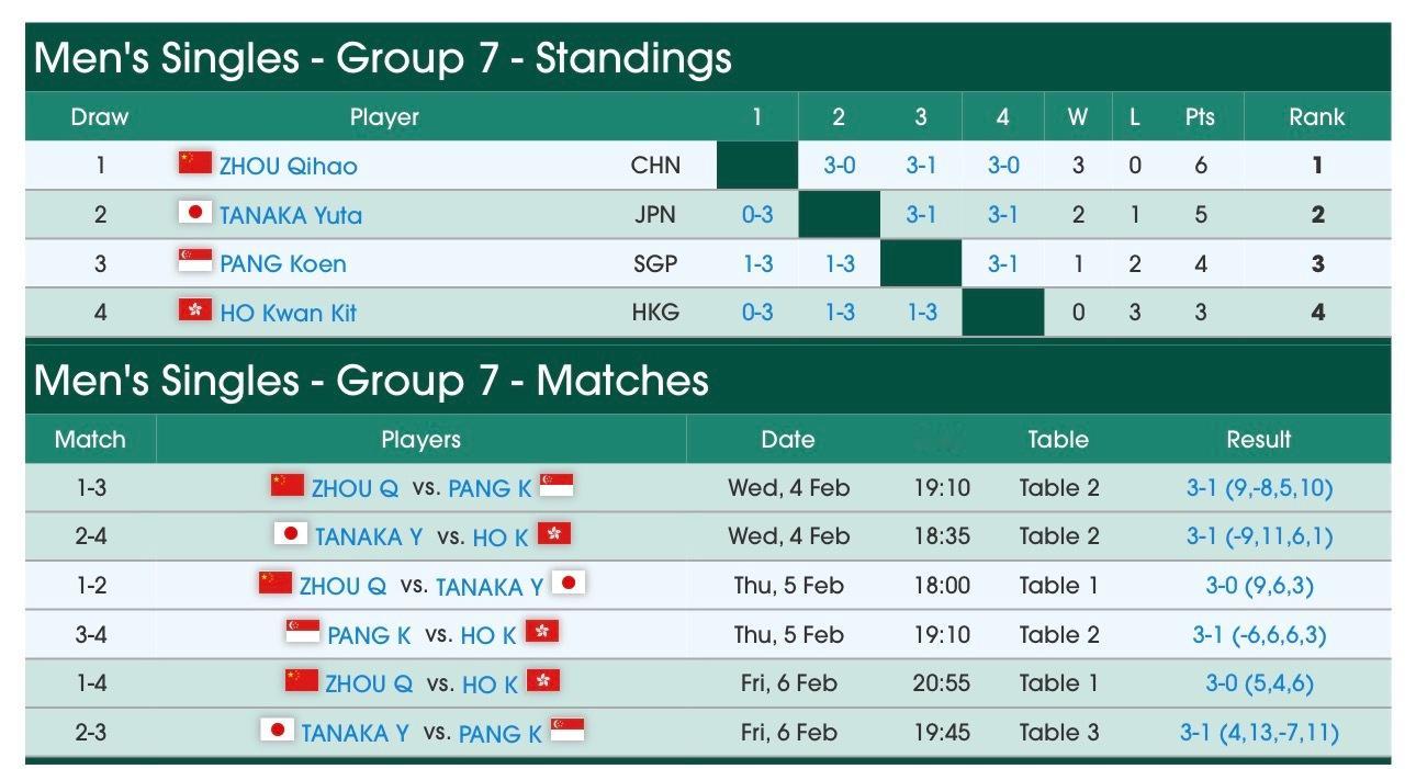 海口亚洲杯男单小组赛第三轮周启豪3比0何钧杰(11-5,11-4,11-6)周启豪晋级第二阶段,将作为淘汰赛7号种子