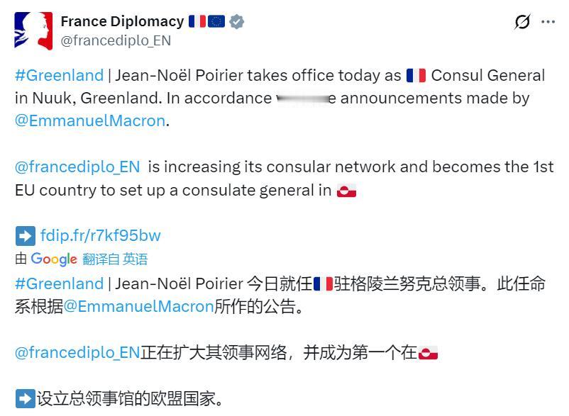 加拿大和法国宣布在格陵兰岛开设领事馆。此举在美国总统特朗普恫言吞併格陵兰岛之际,展示加法两国对当地政府的支持。 加法两国新设的驻努克领事馆于当地时间周五(2月6日)开馆。法国领事为前法国驻越南大使普瓦里耶,他当天正式履职。 另外,本周, 丹麦检查船与加拿大海岸警卫队船只进行了合作演习。