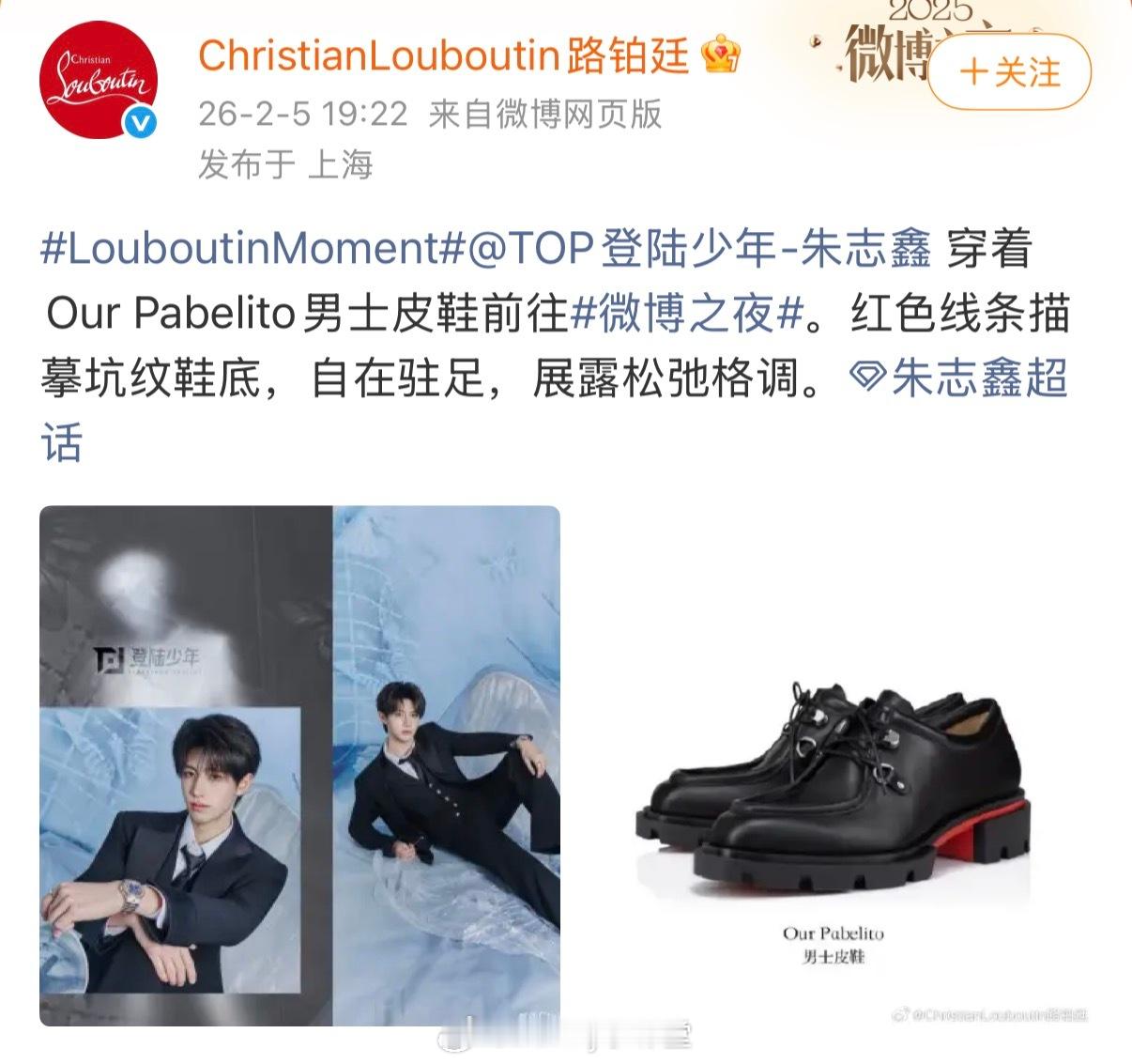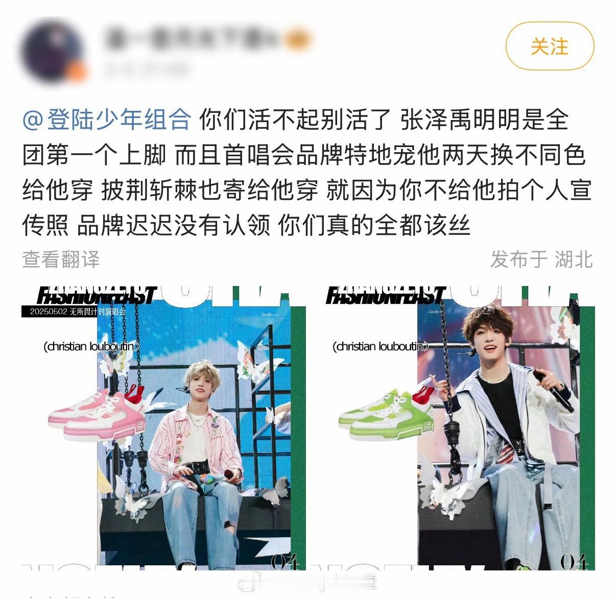 粉丝投稿:昨天朱志鑫崴脚露出红底鞋,被CL官博认领,但粉丝说张泽禹才是全团第一个穿CL的人,都怪公司没有安排拍个人宣传照,要不然张泽禹就被品牌方认领了!这么讲究的吗