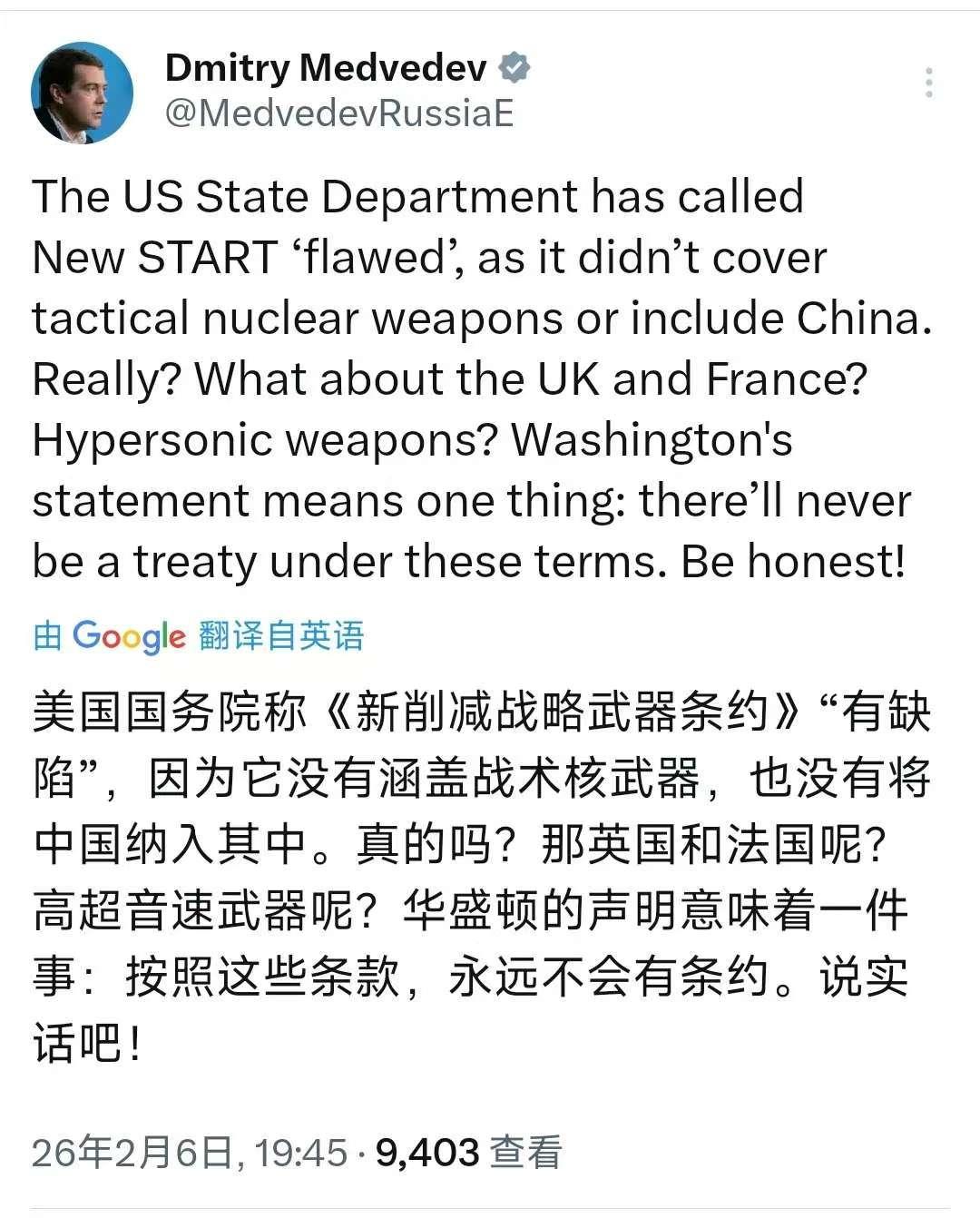 梅德韦杰夫怒怼美国,直揭核军控谈判遮羞布! 今晚,他写道:“美国国务院称《新削减战略武器条约》有缺陷,因为它没有涵盖战术核武器,也没有将中国纳入其中。真的吗?那英国和法国呢?高超音速武器呢?华盛顿的声明意味着一件事:按照这些条款,永远不会有条约。说实话吧!” 美俄核军控最后纽带断裂,美方拿战术核武、中国说事,不过是为毁约找借口。梅德韦杰夫的质问直戳要害:美在欧洲部署百枚战术核弹,英法核武库规模可观,高超音速武器更是美俄都在发力的空白区,美方却选择性失明。从退《中导条约》到拒延新削减条约,美国一贯用双重标准拆解军控体系,如今手握1770枚部署核弹头,却想把更多国家拖入谈判,本质是用规则霸权维持核优势。没有互信的谈判都是空谈,美方若真求稳定,先把自己的核力量管起来,别再搞选择性军控的把戏!