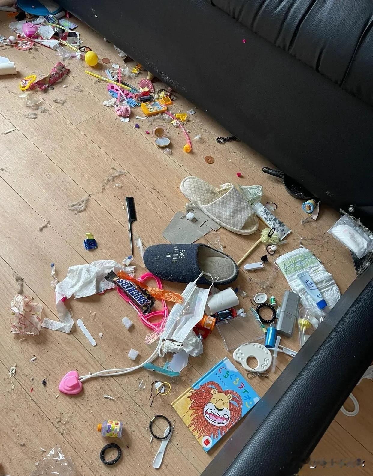 这个床底下是有多久没清理过了,都不能单单用一个懒字来说了。一个生活的地方,每天晚上用来睡觉的地方,这怎么躺的下去的?至少每年大扫除清洁一次吧!即使没东西,床底下的灰尘也对人的呼吸不好。 我真是服了这一家人,只是拖鞋就好几只,东西找不到,他们真的就不四处翻翻? 这样的人,房间的其他地方咋样,真的难以想象!