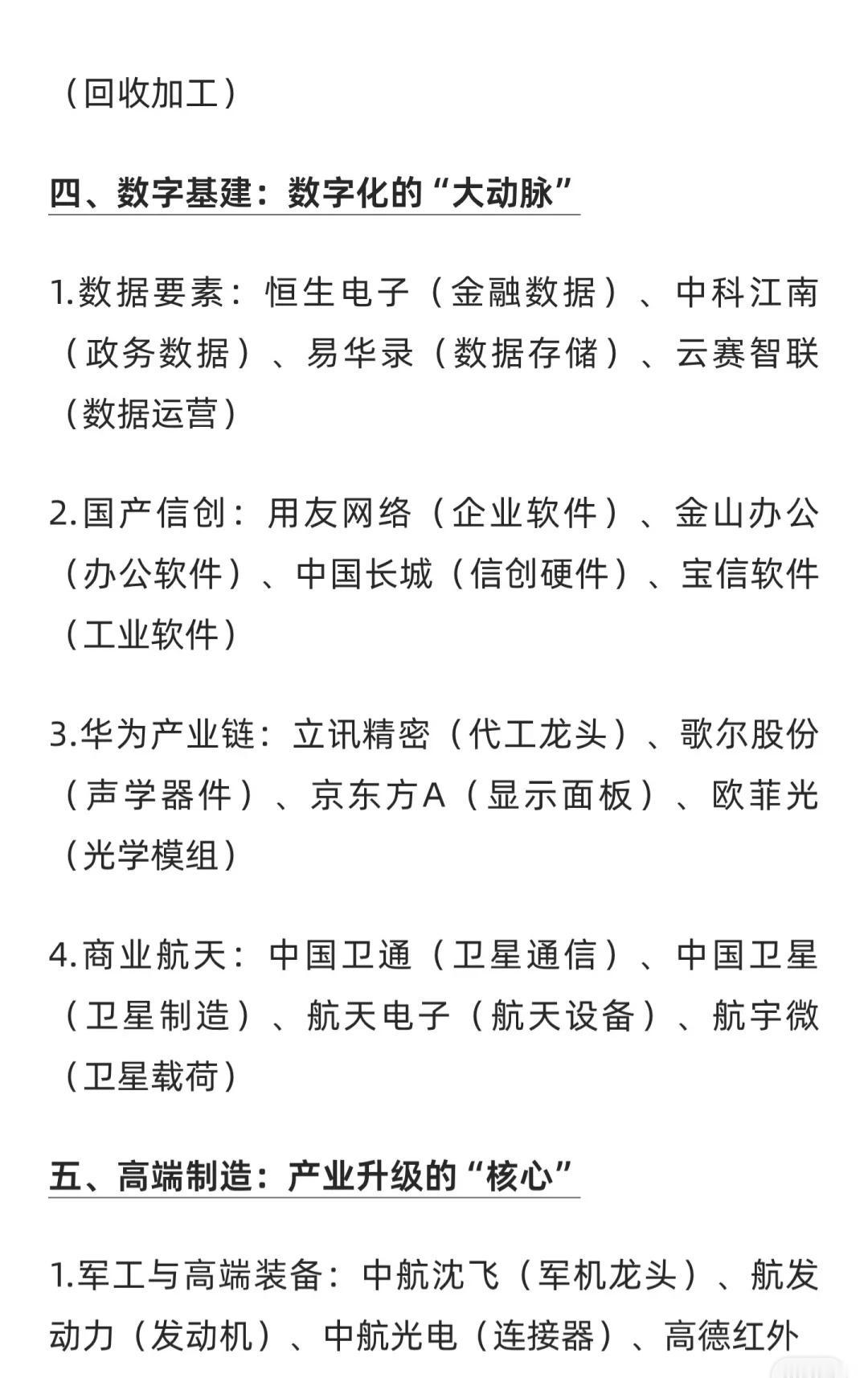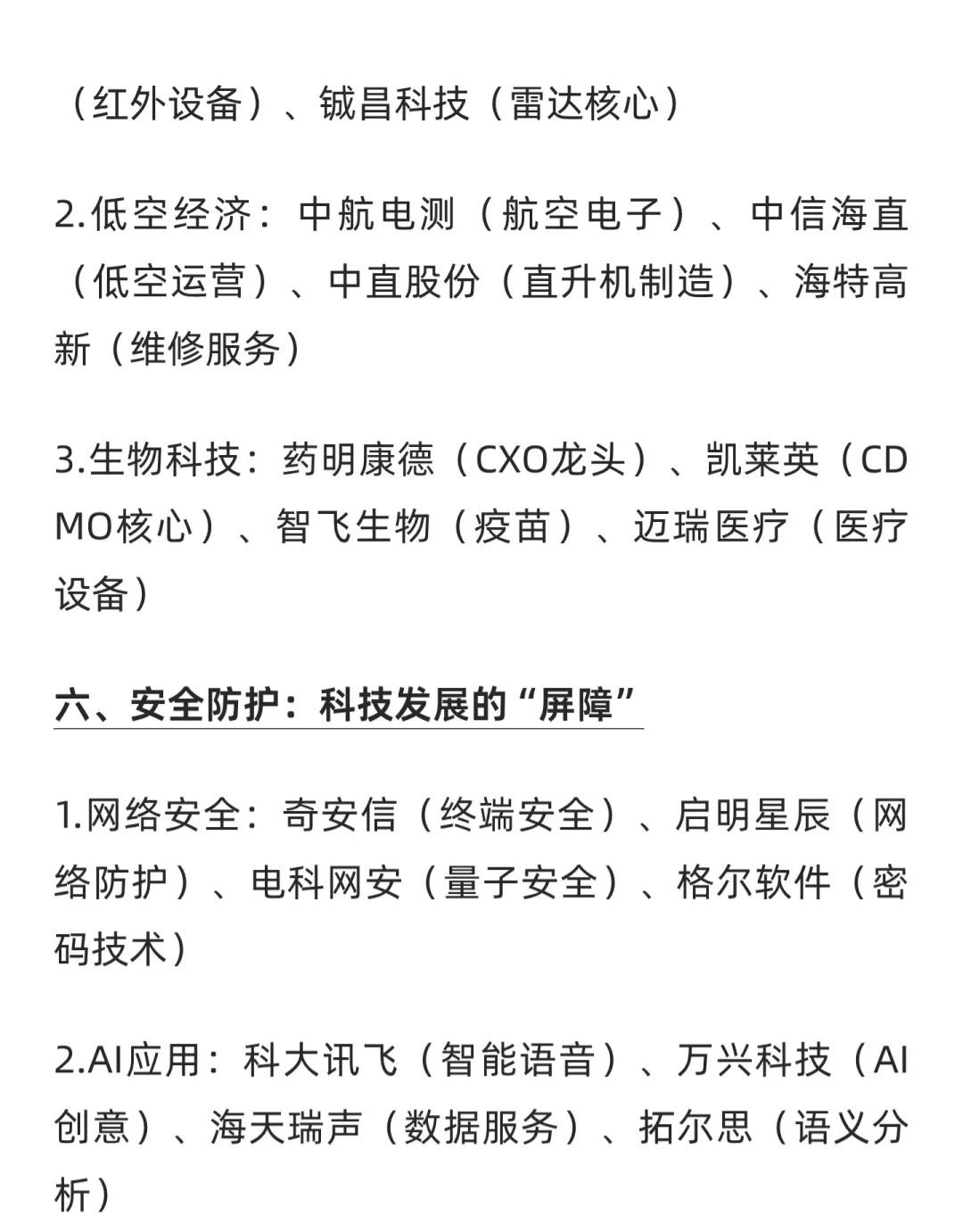 科技产业分类总览 核心硬件(科技基石) 芯片/半导体:中芯国际、中微公司、海光信息、寒武纪、兆易创新、华虹公司 集成电路:深南电路、沪电股份、胜宏科技、景旺电子、生益电子 5G/6G:中兴通讯、光迅科技、长飞光纤、亨通光电、三维通信 前沿科技(未来先锋) 人工智能:工业富联、中科曙光、中际旭创、新易盛、拓维信息 量子科技:国盾量子、华工科技、中科曙光、中国长城 脑机接口:汉威科技、爱朋医疗、岩山科技、创新医疗 人形机器人:三花智控、中大力德、卧龙电驱、长盛轴承、拓普集团 能源科技(双碳新引擎) 储能:宁德时代、比亚迪、亿纬锂能、先导智能、国轩高科 氢能源:亿华通、隆基绿能、宝丰能源、潍柴动力 稀土永磁:北方稀土、中国稀土、金力永磁、盛和资源 数字基建(数字化大动脉) 数据要素:恒生电子、中科江南、易华录、云赛智联 国产信创:用友网络、金山办公、中国长城、宝信软件 华为产业链:立讯精密、歌尔股份、京东方A、欧菲光 商业航天:中国卫通、中国卫星、航天电子、航宇微 高端制造(产业升级核心) 军工与高端装备:中航沈飞、航发动力、中航光电、高德红外、铖昌科技 低空经济:中航电测、中信海直、中直股份、海特高新 生物科技:药明康德、凯莱英、智飞生物、迈瑞医疗 安全防护(科技屏障) 网络安全:奇安信、启明星辰、电科网安、格尔软件 AI应用:科大讯飞、万兴科技、海天瑞声、拓尔思