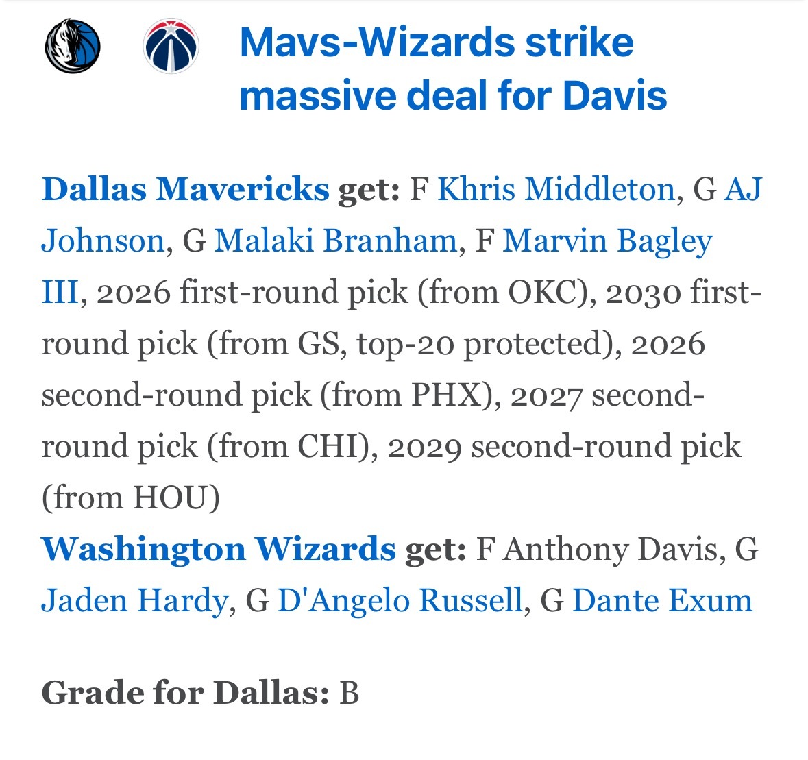 达拉斯独行侠得到:米德尔顿、AJ·约翰逊、布拉纳姆、巴格利、2026年首轮签(来自雷霆)、2030年首轮签(来自勇士,前20顺位保护)、2026年次轮签(来自太阳)、2027年次轮签(来自公牛)、2029年次轮签(来自火箭)