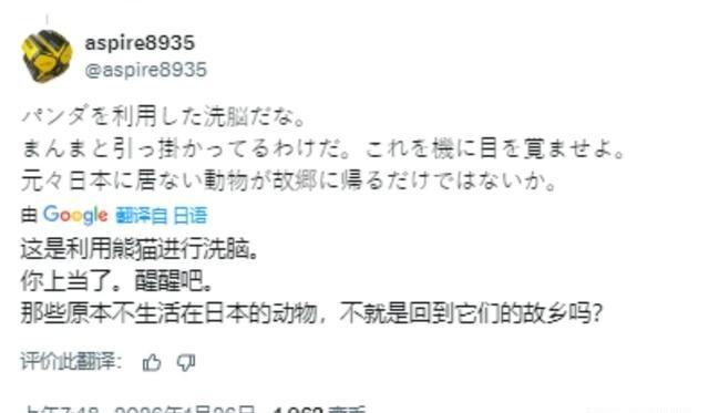 脸都不要了!归还中国大熊猫后,日本右翼抹黑中国,会吃掉熊猫 晓晓和蕾蕾归国基于租赁协议到期,比力和仙女已于2024年返回,香香2023年先行。协议遵循国际公约,大熊猫所有权在中国,仅用于科研,不能买卖。日本支付租金约1亿日元,加上饲养成本。归国消息后,日本民众反应强烈,上野动物园开放告别期,申请人数众多,最后一天中签率低。民众表达不舍,形成对比。 右翼势力散布负面言论,质疑安保落泪合理性,忽略共情,暴露偏见本质。随后谣言称熊猫回国将被食用,无视中国保护法,大熊猫为一级保护动物,设有专业基地。右翼讨论食用方式,帖文传播广,显示偏见严重。这种抹黑回避日本捕鲸争议,国际批评多年未止。右翼抱怨成本高,却忽略效益,据估算每年308亿日元,合人民币超15亿。上野推出多类熊猫商品,推动经济。 右翼通过网络放大谣言,激化矛盾,帖文称离开节省预算,暴露无知。高市政府右倾路线,介入台湾,加剧紧张,暂停续租。在背景下,右翼攻击,指责政治报复,忽略协议。民众惜别与谣言对比,许多网友反击,指出熊猫在中国保护良好。商家担忧游客减少,影响产业。右翼煽动对立,凸显社会矛盾。 1月27日,晓晓和蕾蕾从上野运往机场,专业护送,返回成都后入基地隔离。中国外交部回应,按协议执行,欢迎日本民众访华。日本进入无熊猫状态,和歌山熊猫已返回,标志时代到来。教授分析,合作源于保护,但政府言论恶化关系,阻断续租。日本损失效益,上野消费衰退,民众慰藉缺失。 右翼抹黑未破坏友好,网友驳斥谣言,称熊猫保护良好。高市推动政策,紧张持续。田中开创熊猫外交见证变迁,民间基础存在,右翼行为无效,无法阻挡愿望。