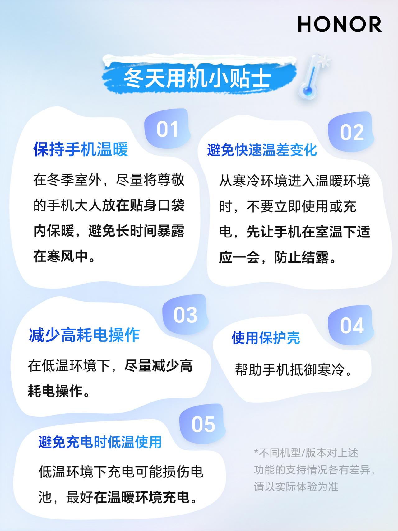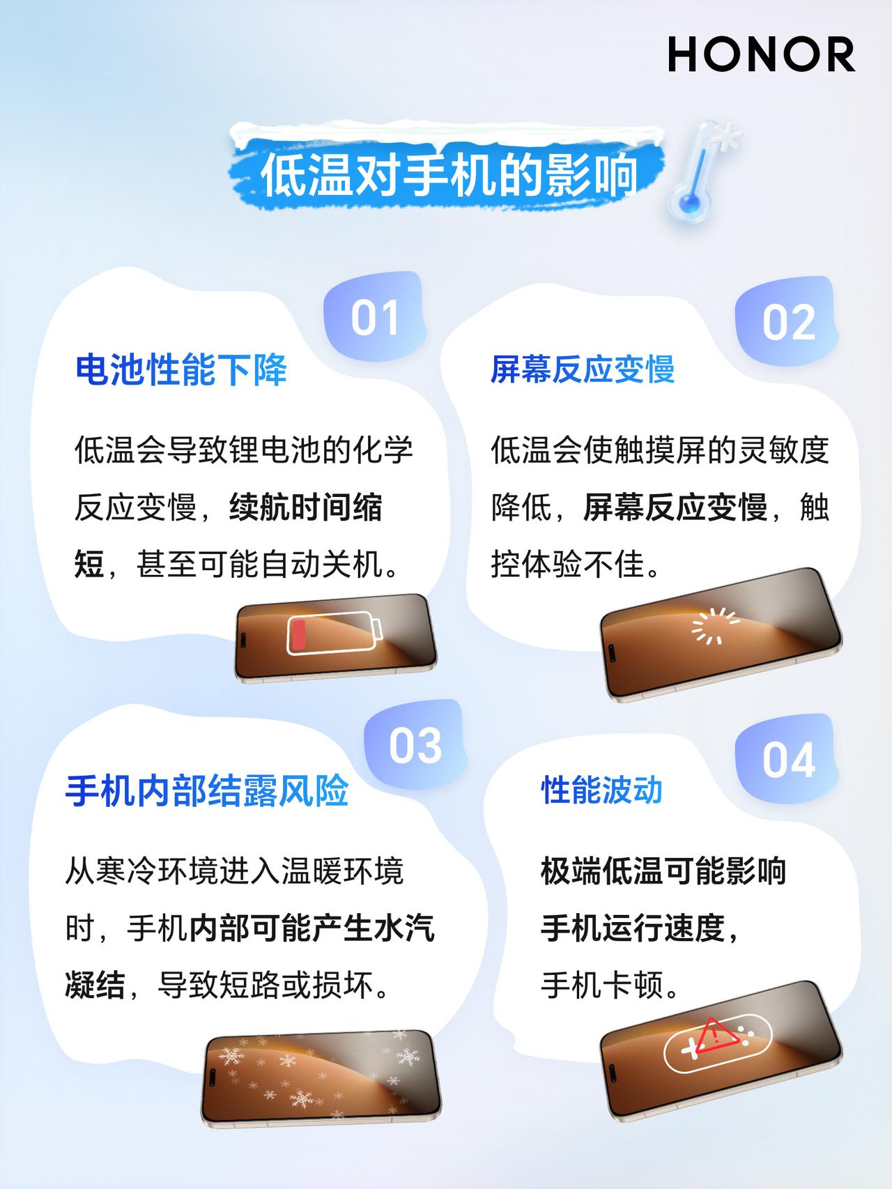 小伙伴们有没有发现,冬天温度较低的情况下,使用手机会出现屏幕反映变慢,而且电量也会比平时掉的要快哪一些呢?其实这些情况是正常的,荣耀客服通过一组图文,为大家解答出现这些情况的原因,并且给出了较为合理的应对方式。 冬季室外温度较低的情况下,建议大家将手机贴身存放,这样能够更好的保护内置电池,触摸屏也能够保持灵敏度,避免了寒冷进入温暖环境时产生水汽凝结的情况,保证手机流畅度。温度较低的情况下尽量减少使用,手机壳也能御寒。 通过日常生活中,小伙伴们在使用的时候,要保证手机要不太冷,当然也不能太热。现在只需关注 @超逸谈科技 并转发此微头条,2026年02月08日,将由 选出1位粉丝包邮送出暖暖杯55度礼品装,说不定下一个中奖的就是你哟抽奖详情