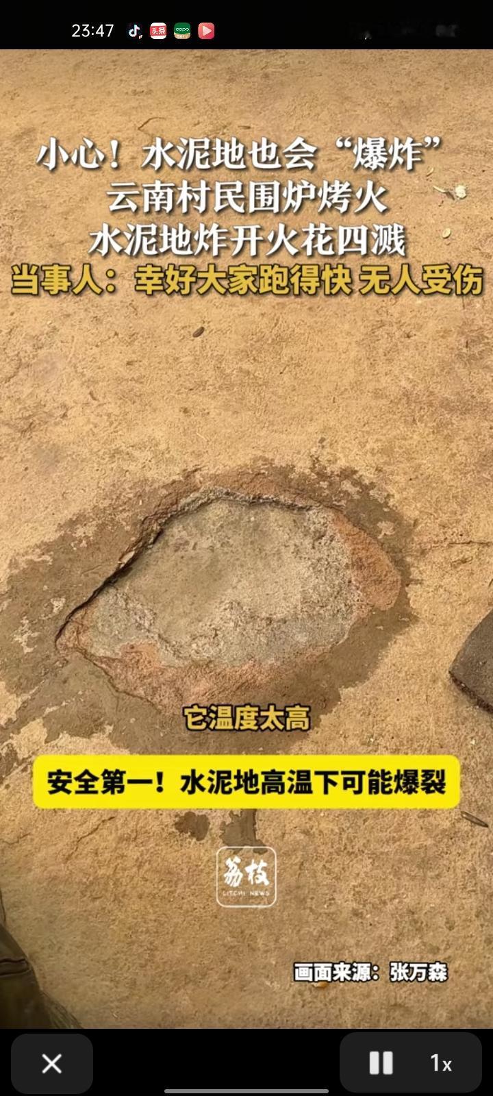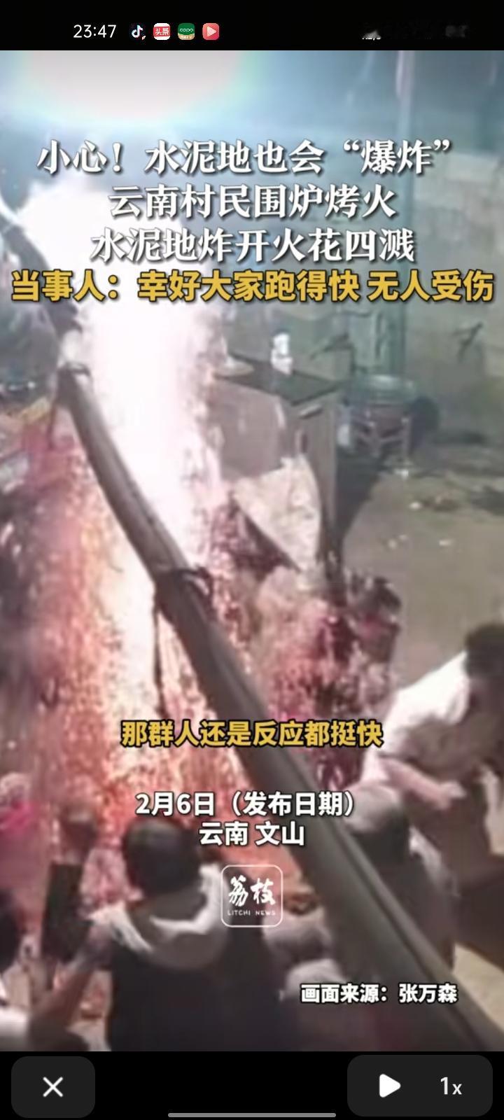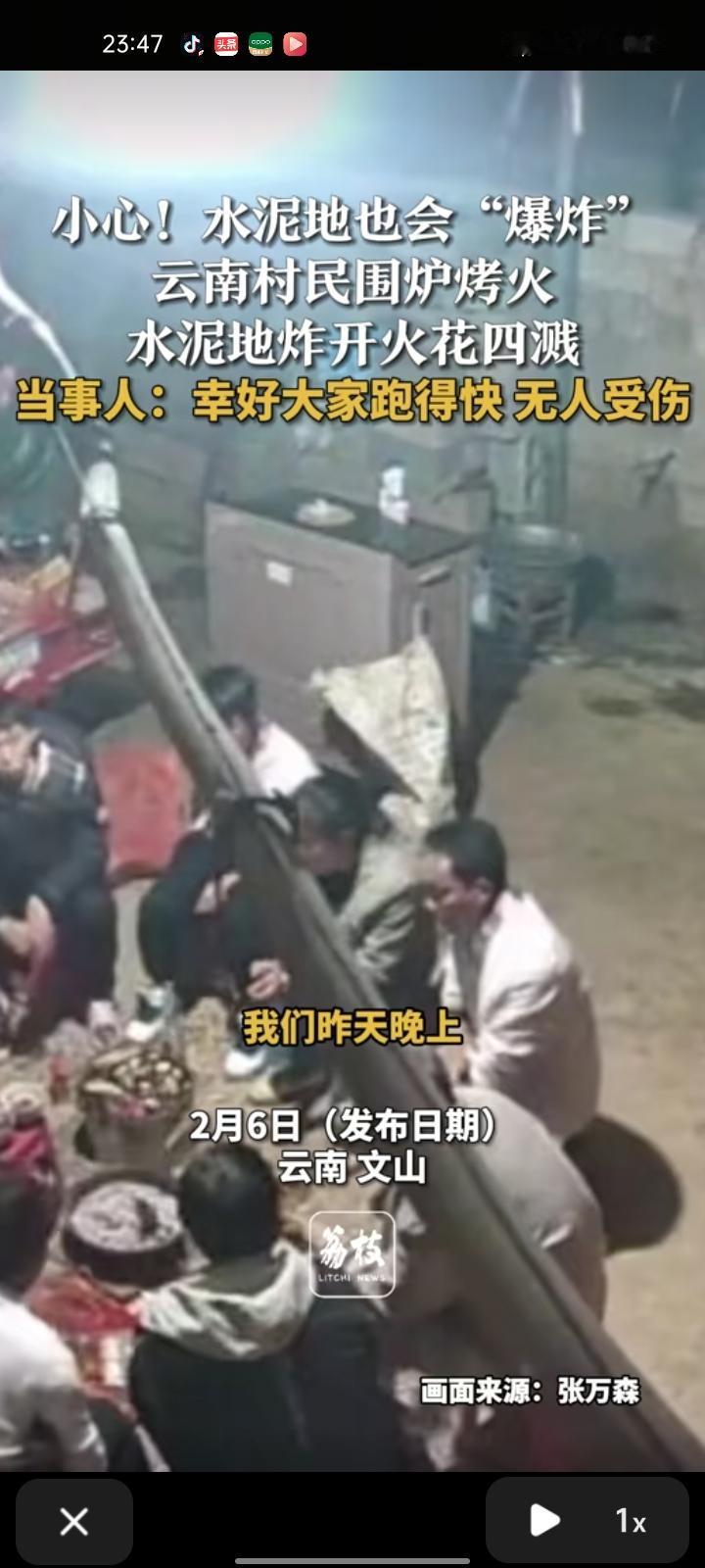 2月6日,文山州丘北县。村民们围炉烤火,水泥地炸开火花四溅,他们反应挺快的就跑开了,忘记下面垫东西隔热,所幸无人受伤,水泥地炸出一个洞。 水泥地在高温下可能爆裂,所以人们在水泥地上烧火谨记:安全第一!