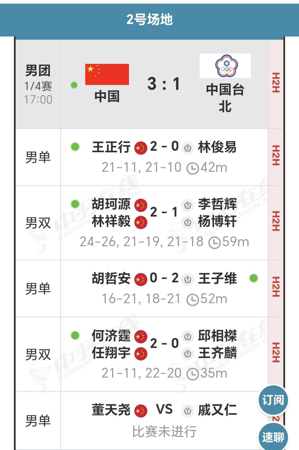 不得不佩服教练组的大胆排兵布阵,把小组赛状态不好的王正行继续打头阵,最终实现奇兵作用,把看是实力强大的省队淘汰出局 今天下午进行的男团8强战,国羽男团对阵全是世界排名高于我们小将们的顶级选手的省队台北队,三个男单林俊易排名11位,王子维排名33位,戚又仁排名21位,两对男双李哲辉/杨博轩世界排名11位,邱相榤/王齐麟排名13位。反观国羽男团小将的排名王正行排名30位,是小将中排名最高的一个,胡哲安排名59位,董天尧排名79位,男双胡珂源/林祥毅排名57位,任翔宇何济霆排名已掉至145位,从牌面看国羽男团实力远远低于省队实力,所以就有人认为国羽男团凶多吉少,被淘汰出局是大概率事件,可就是这么一副看是注定要输的牌面,被我们小将们打活了: 首场单打王正行21-11、21-10轻松横扫林俊易,先拔头筹,1-0领先。 第二场男双,国羽小将胡珂源/林祥毅真是值得表扬和肯定,面对强大对手,又是先失一局,硬是靠必胜信念努力拼搏,最后以2-1逆转翻盘险胜李哲辉/杨博轩,为国羽男团再取关键一分。 第三场二单,胡哲安压力山大想赢怕输,反而表现不佳,最后0-2不敌王子维,大比分2-1。 第四场二双,任翔宇/何济霆毕竟是经验丰富,关键时刻稳得起,第二局在关键分上考验大心脏,最后以22-20拿下带走比赛,助国羽男团锁定胜局,大比分3-1淘汰台北队,把一盘看似死棋给打活了,恭喜国羽男团小将们晋级四强,继续加油冲![赞][烟花][点亮平安灯]