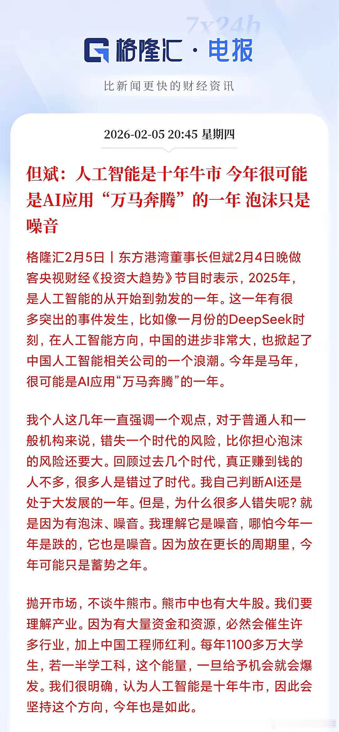 私募大佬但斌的最新判断炸了圈:人工智能是“十年牛市”,今年将是AI应用“万马奔腾”之年,眼前的泡沫和下跌都只是“噪音”。