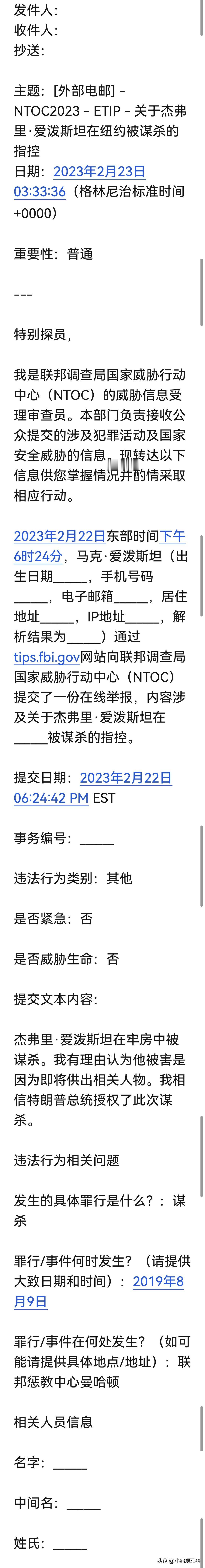 🇺🇸📁 — 马克·爱泼斯坦于2023年2月22日向美国联邦调查局提交了一份在线举报,指控美国总统特朗普授权在大都会惩教中心的牢房中杀害了他的哥哥杰弗里·爱泼斯坦(美国已故亿万富翁、金融家): “杰弗里·爱泼斯坦在监狱牢房中被杀害。我有理由相信他之所以被杀,是因为他即将揭发一些人的名字。我认为特朗普总统授权了对他的谋杀。” 这份文件出自美国司法部2025年12月底的文件档案。