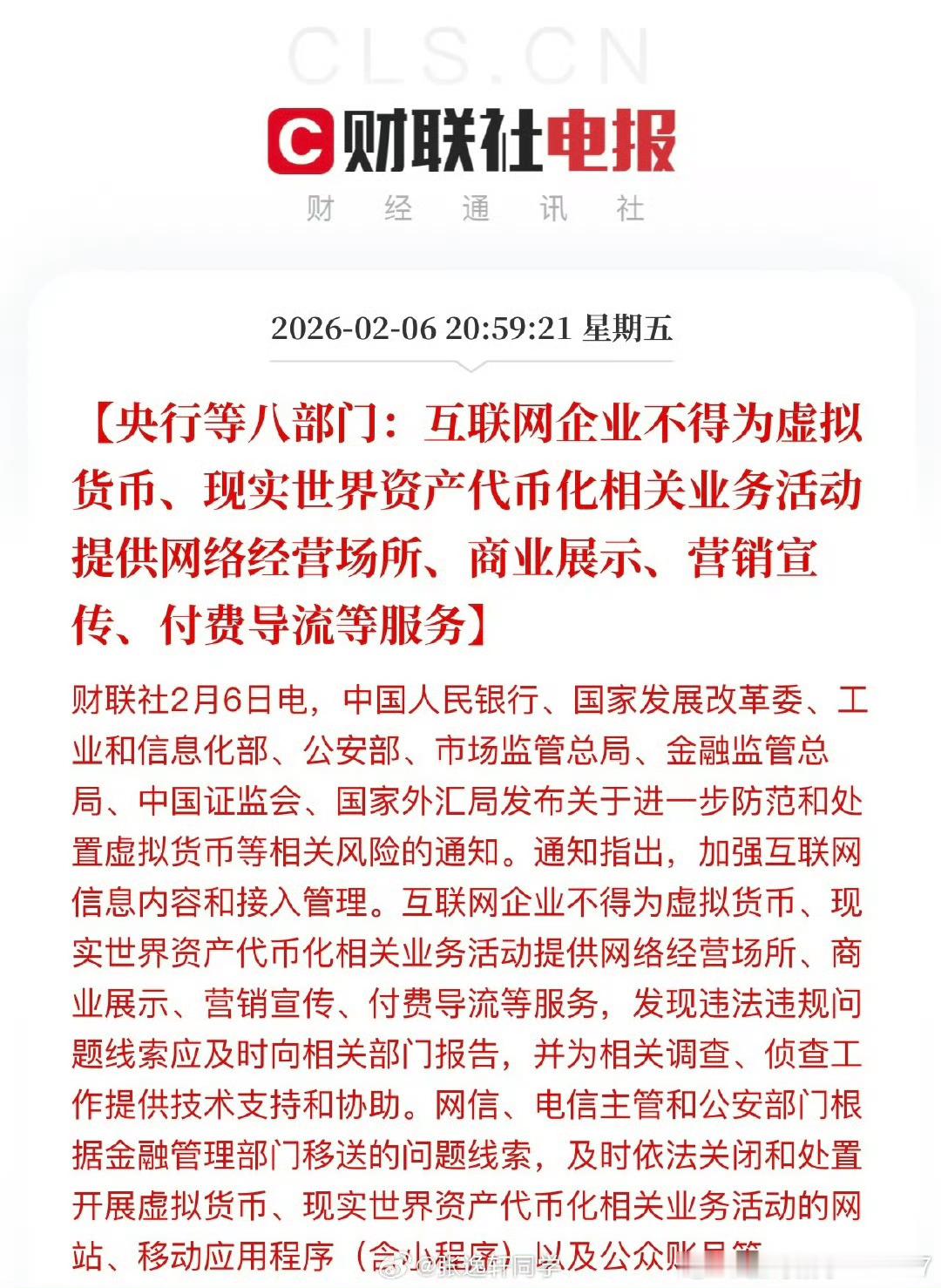 【央行等八部门:互联网企业不得为虚拟货币、现实世界资产代币化相关业务活动提供网络经营场所、商业展示、营销宣传、付费导流等服务】