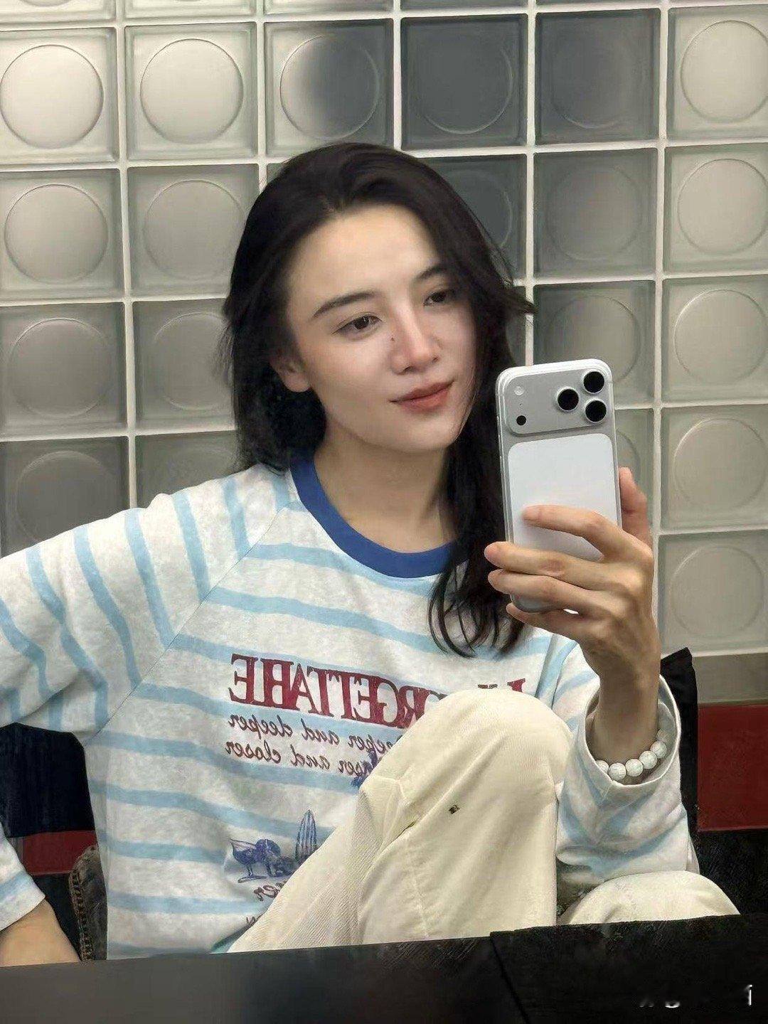 宋佳的中年穿搭太有范了!条纹长袖搭米色长裤,简约休闲还超减龄,随性自在的氛围感拉满~