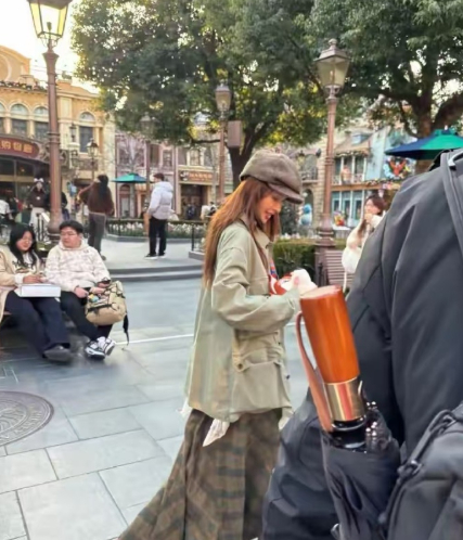 金晨迪士尼被偶遇,背着狐尼克的包,穿搭时尚