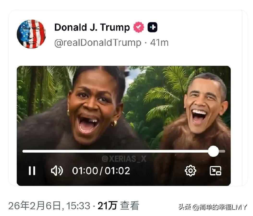 特朗普又惹下了是非!NBC新闻2月7日爆出,他发了段视频,把奥巴马夫妇说成猿猴,满是种族歧视的恶意。没过多久,这段视频被删了。白宫先是跳出来辩解,转头又把锅甩给了一个工作人员。 这操作,真是又下作又假。拿种族当武器,往别人身上泼脏水,早已越过了文明的底线。这种仇恨言论,像是往平静的湖里扔石头,激起的是分裂和对立,伤的是所有人对平等的期待。 发出去的东西,删了就没事了?做错了事,找个下属背锅就完了?这哪有半点担当?分明是心里没把这事当回事,觉得删了、赖了,就能蒙混过关。 种族歧视这东西,就像附骨之疽,一旦在心里扎了根,总会冒出来作祟。特朗普这举动,哪是一时糊涂?分明是骨子里的偏见在作祟。嘴上喊着“平等”“人权”,转头就用最卑劣的手段攻击别人,这脸打得也太响了。 美国总把自己的“人权神话”挂在嘴边,可看看这出闹剧——领导人公然散播种族仇恨,事后还百般抵赖。这神话,怕是要成笑话了。平等不是喊出来的,是做出来的。连最基本的尊重都没有,谈何人权? 老话说“身正不怕影子斜”,可心里要是歪了,做出来的事能正到哪去?把别人比作猿猴,这不是玩笑,是侮辱,是对一个种族的践踏。这种话从一个曾经的总统嘴里说出来,传出去,让世界怎么看? 白宫那套“甩锅”把戏,大家也见得多了。出了问题,永远是“临时工”的错,永远是“不知情”。可真当别人傻吗?谁发的,谁默许的,明眼人都看得清楚。这种敷衍,比事件本身更让人寒心。 说到底,这不是小事。种族裂痕一旦扩大,受伤的是整个社会。今天能这么对奥巴马夫妇,明天就能这么对其他族群。仇恨这东西,一旦开了头,就很难收住。 特朗普删了视频,却删不掉心里的偏见。白宫甩了锅,却甩不掉该负的责任。这种卑劣又虚伪的操作,只会让更多人看清,所谓的“美式人权”,不过是选择性失明的遮羞布。 尊重别人,就是尊重自己。连这最基本的道理都不懂,还谈什么领导?这出闹剧,与其说是个意外,不如说是一次暴露——暴露了某些人心里的阴暗,暴露了所谓“平等”的脆弱。 删了视频不算完,找了替罪羊也不算完。真正该做的,是承认错误,是反思自己。可看这架势,怕是难。毕竟,有些人宁愿活在自己的偏见里,也不愿抬头看看真实的世界。 只是,世界看得清楚。这出闹剧,不仅丢了特朗普的脸,丢的是整个美国在世人心中的形象。平等和尊重,不是口号,是底线。踩了底线,就该付出代价。