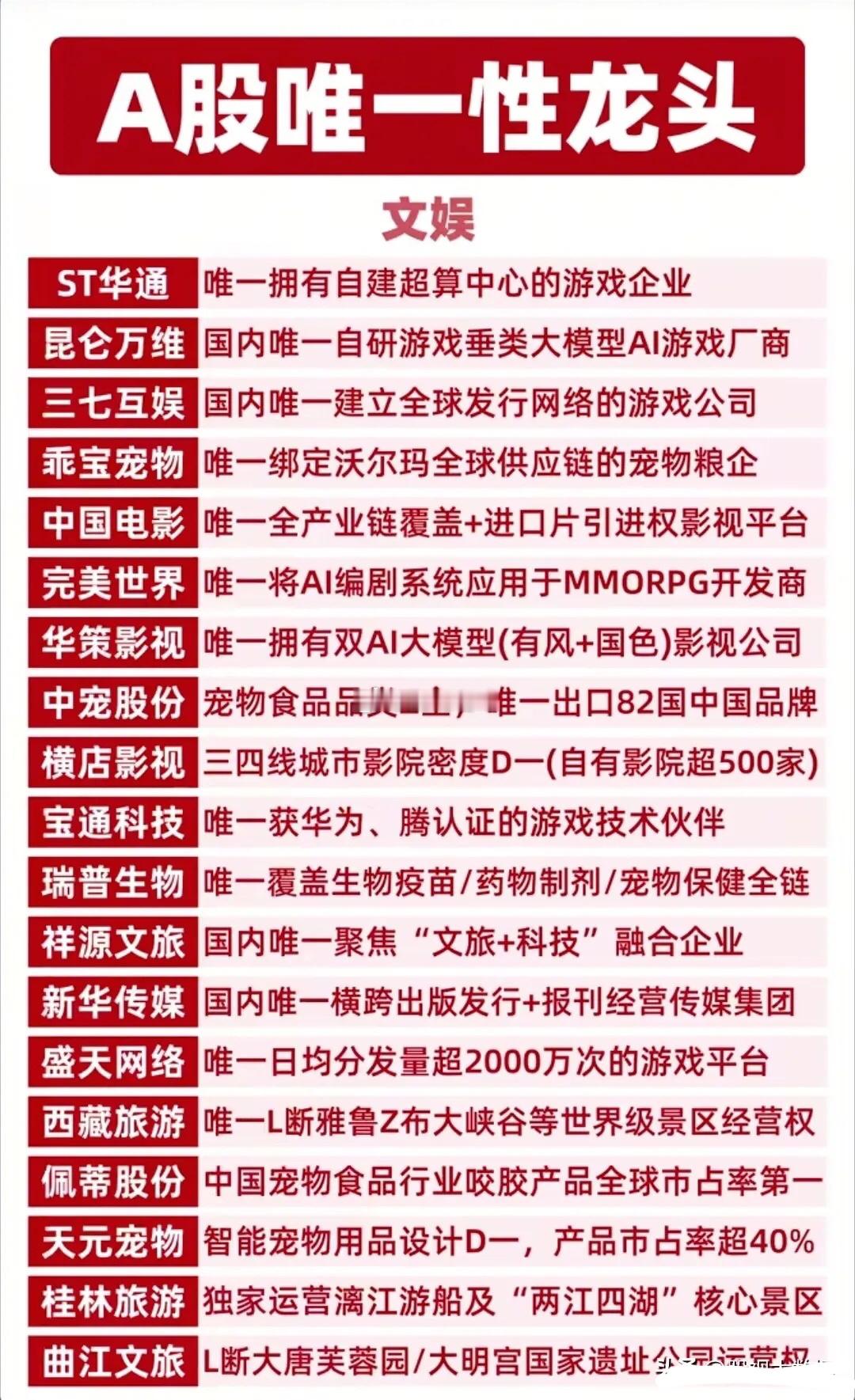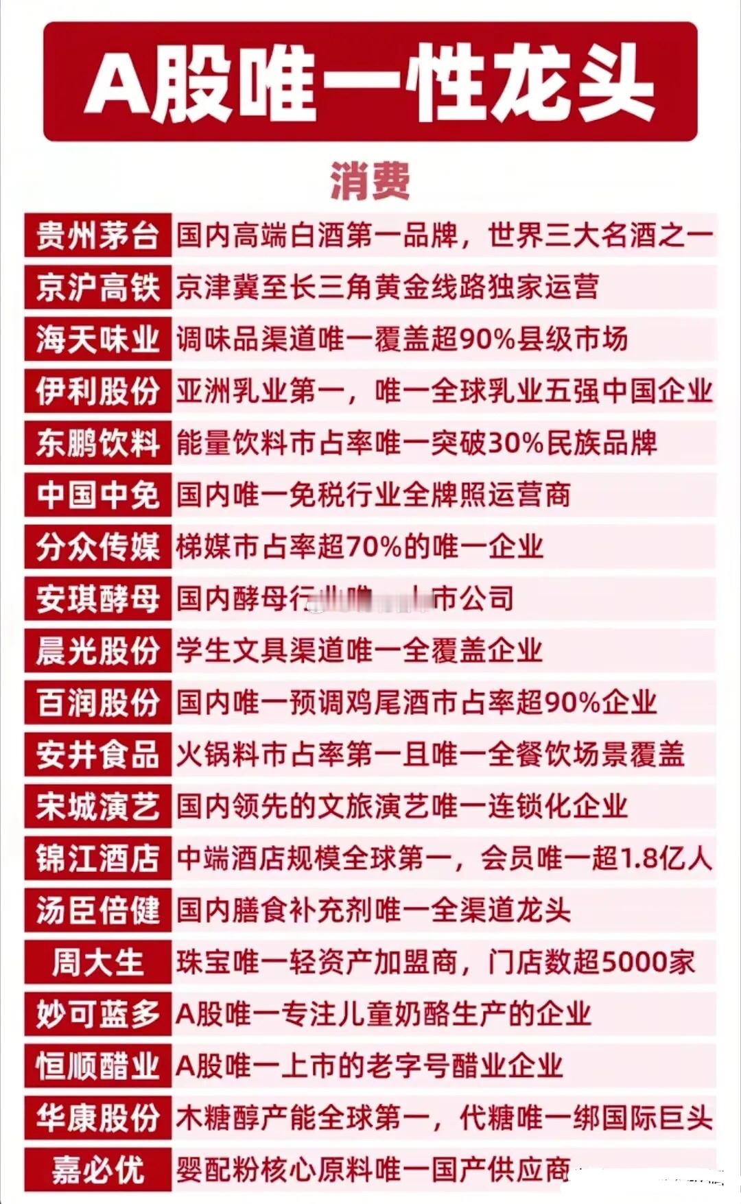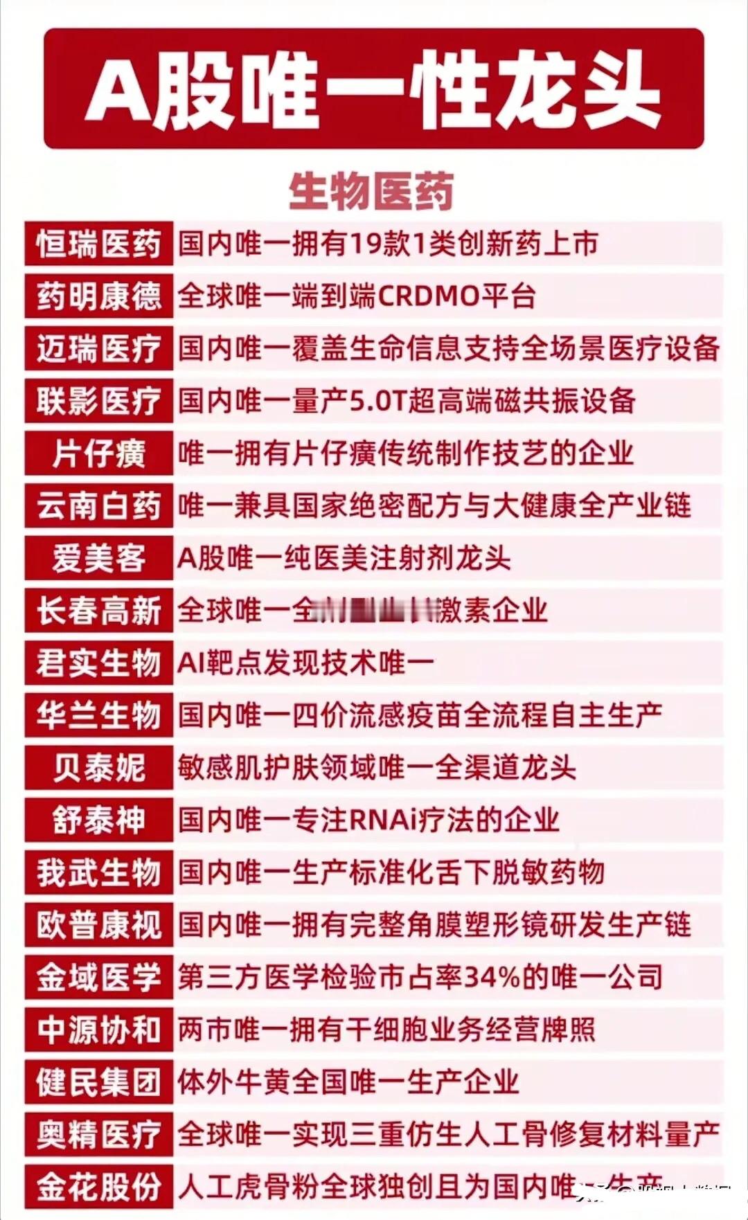 A股唯一性龙头全梳理!核心标的值得硬核收藏!这份名单涵盖能源资源、固态电池、工程机械、文娱、消费、生物医药、科技创新七大核心赛道,挖掘各领域真正具备“唯一性”的龙头企业。硬核逻辑,一眼看懂核心竞争力,赛道龙头,把握产业发展主脉络。这份名单,是你布局A股的硬核参考,建议收藏反复研究!
