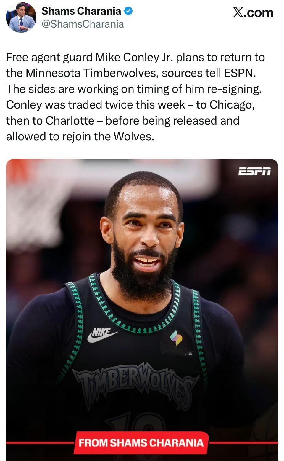 据ESPN消息源透露,自由球员后卫小迈克·康利计划重返明尼苏达森林狼队,双方正在就他重新签约的时间进行协商。 在被裁掉并获准重返森林狼之前,康利在本周内经历了两次交易——先是被送到芝加哥,随后又被交易至夏洛特。