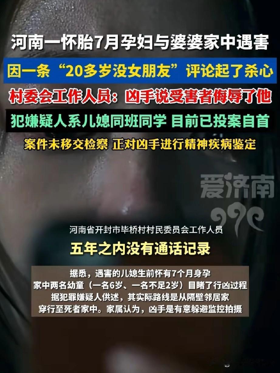 太残忍了。河南开封,一对婆媳被一个21岁的小伙杀害,小伙是儿媳的初中同学,两人5年多没有联系。因为儿媳在社交平台的一句评论,让凶手起了杀心。 这个儿媳当时怀孕7个多月了,刷抖音时刷到男同学的账号,她说了一句20多岁了还没有女朋友之类的话,她可能觉得是无心的一个调侃,可在男同学那里,就成了侮辱他。 其实这句话在普通人眼里,真算不了侮辱。挺多反驳几句也就算了,肯定是不会报复的。可是男子有抑郁症躁狂症,他记仇了。他准备好尖刀去了被害人家里,婆婆为了保护儿媳,一同被杀害。 说实话,凶手确实很残忍,连孕妇和老人也不放过,应该严惩。但是女子和凶手是同学,他是什么性格你应该知道的,这种偏执性格的人,你为什么去招惹他呢?应该躲的远远的,可能就不会有这起悲剧了。 对于这件事,你怎么看呢?