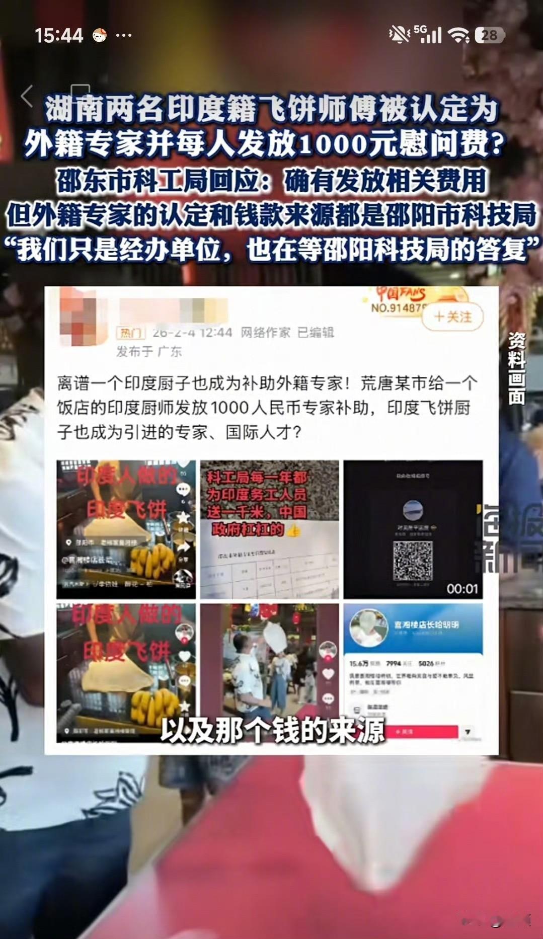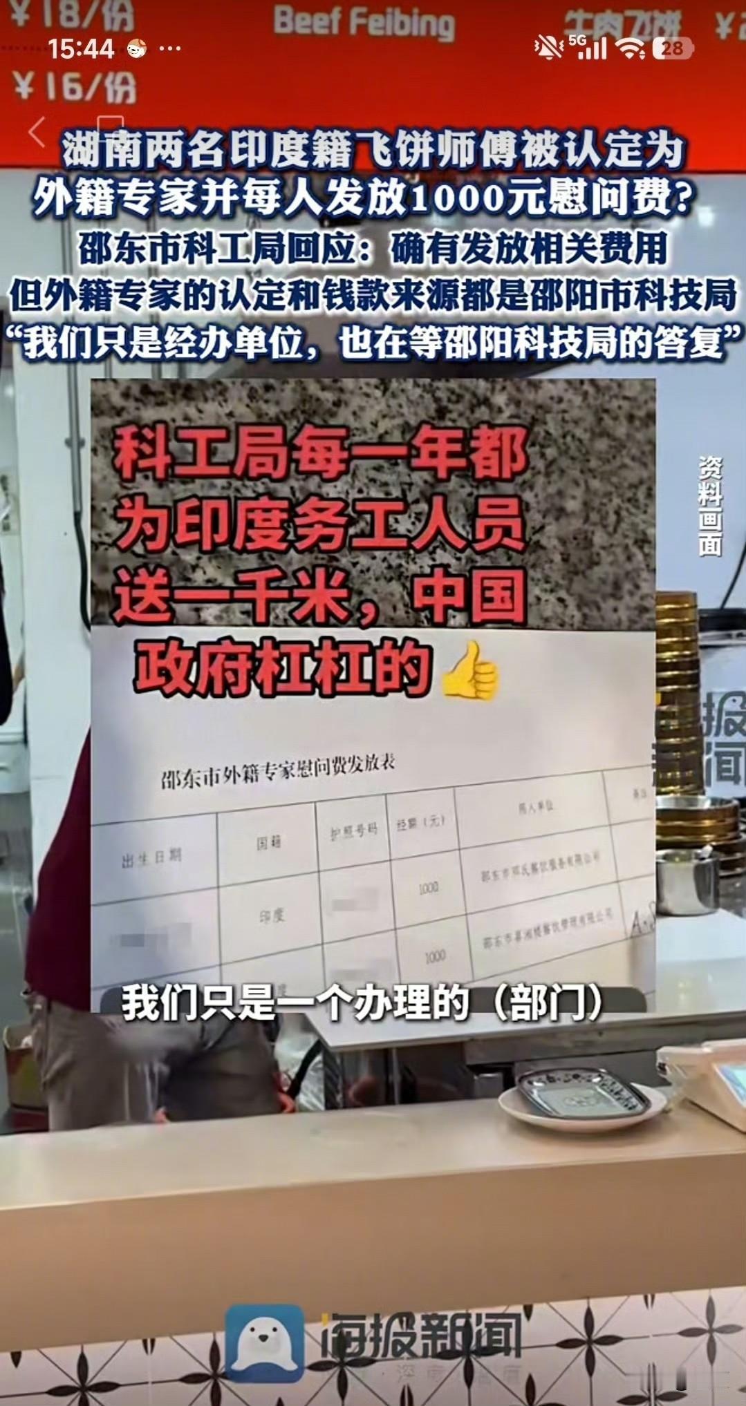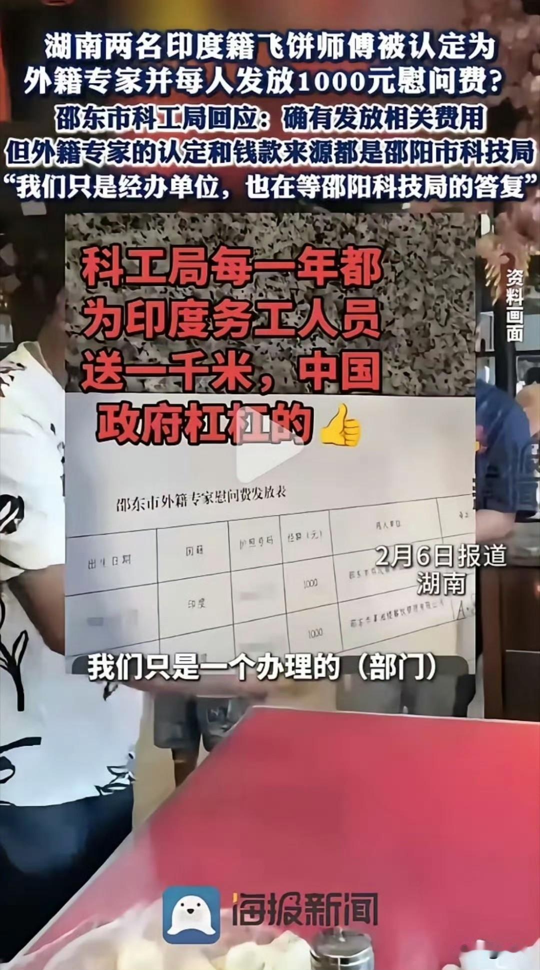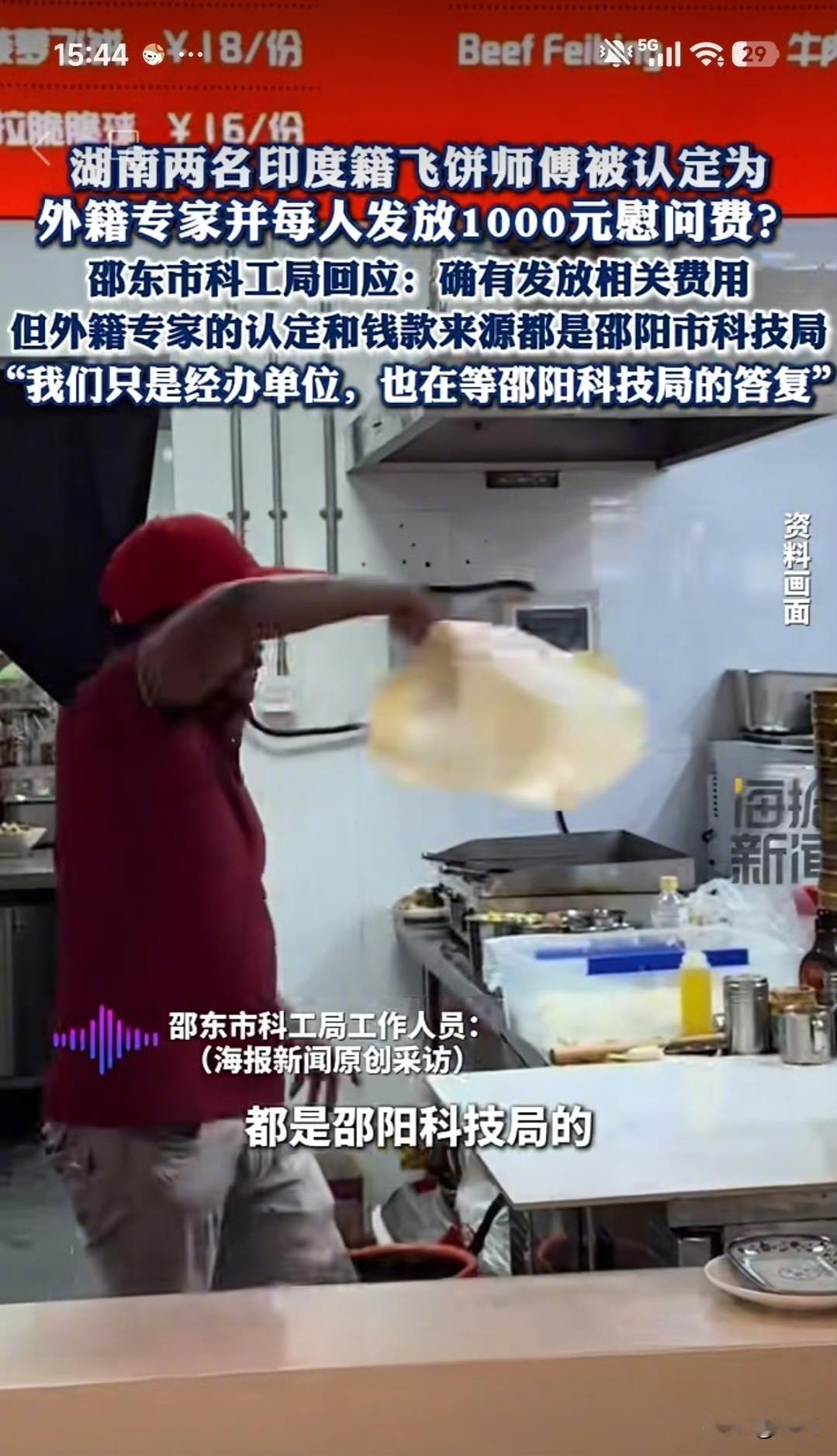 网络爆料称湖南邵东市两名印度飞饼师傅被认定为“外籍专家”,每人获得1000元慰问