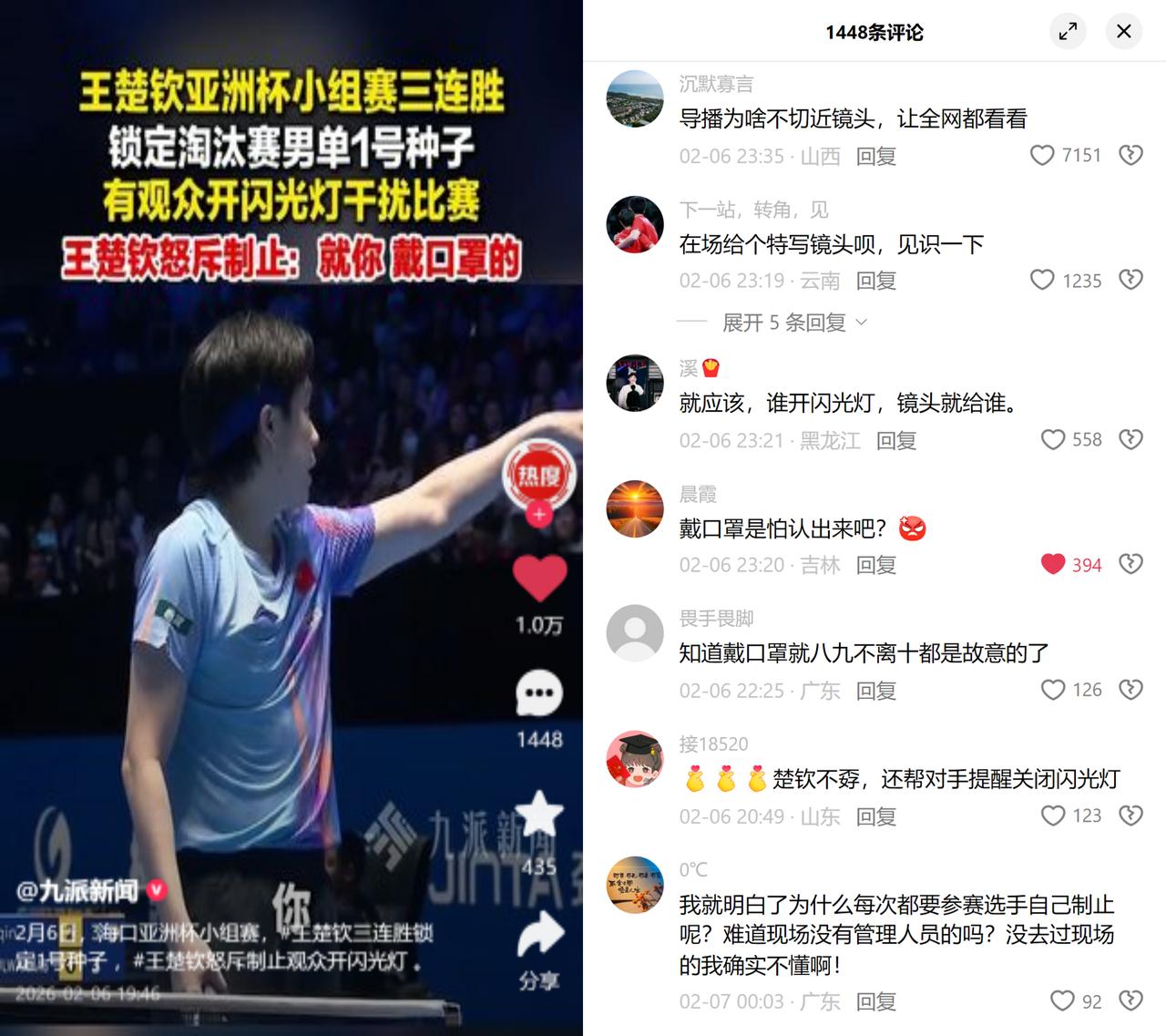 王楚钦赛场怒喝闪光灯观众 海口亚洲杯上,王楚钦在锁定种子席位的关键战中,被开闪光灯的观众干扰,直接点名制止。这事儿传开后,大家一边力挺他护赛,一边吐槽现场安保缺位。 别光揪着观众骂,这事儿藏着双重漏洞。乒乓球的特殊属性决定了闪光灯是致命干扰,球速飙到170km/h,运动员得在0.15秒内预判球路,闪光灯的视觉残像能持续0.1秒,等于瞬间蒙眼,不光丢分还可能引发伤病。可不少观众压根没这常识,以为和拍篮球足球没区别。 更关键的是规则执行太软:国际乒联早就禁了比赛时用闪光灯,但过往孙颖莎、林高远遇干扰时,大多只有口头提醒,很少真落实处罚,最后只能靠运动员自己维权。 说到底,尊重规则从来不是空话。观众多懂点门道,主办方多上点心,才是对运动员真的保护。你遇过类似的规则缺位吗?