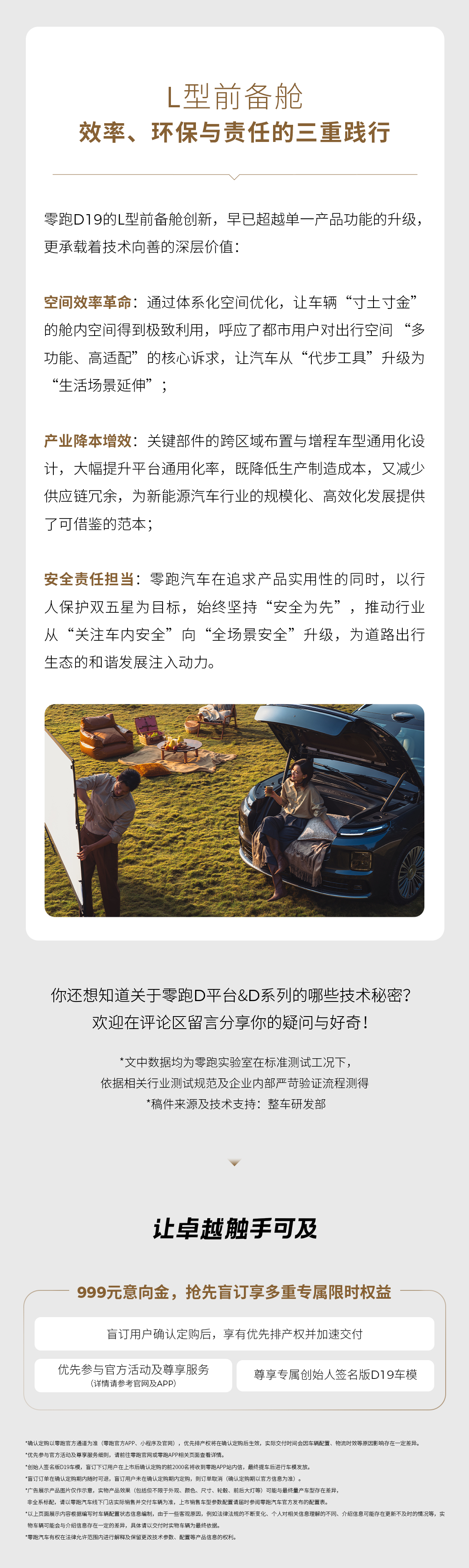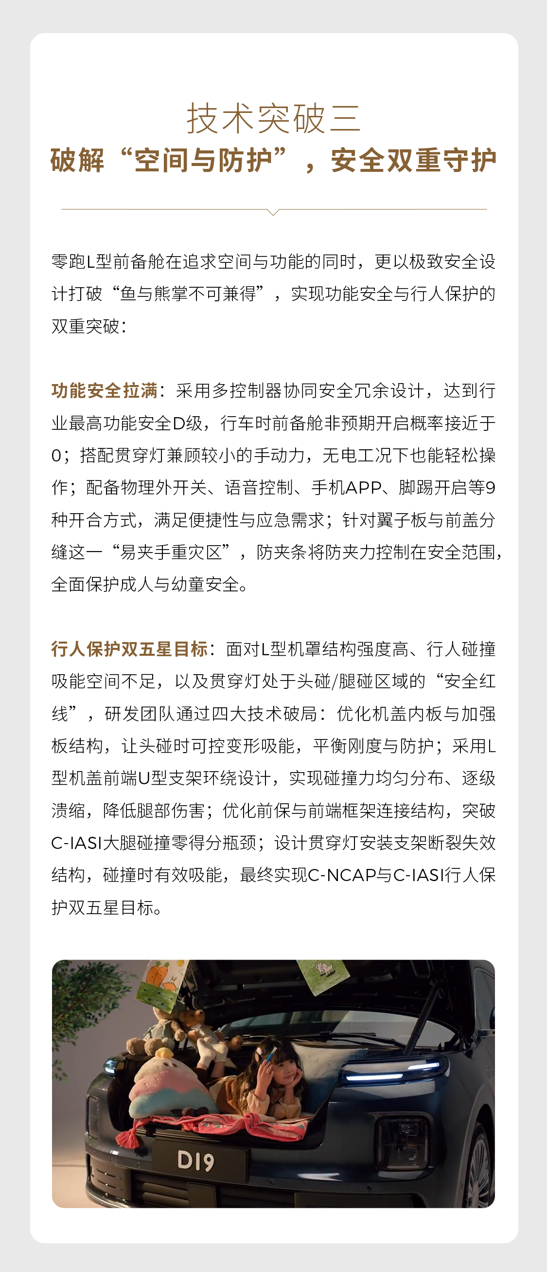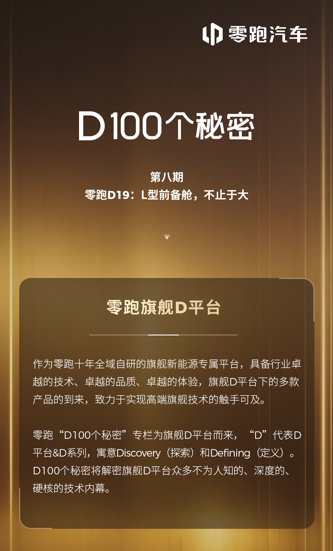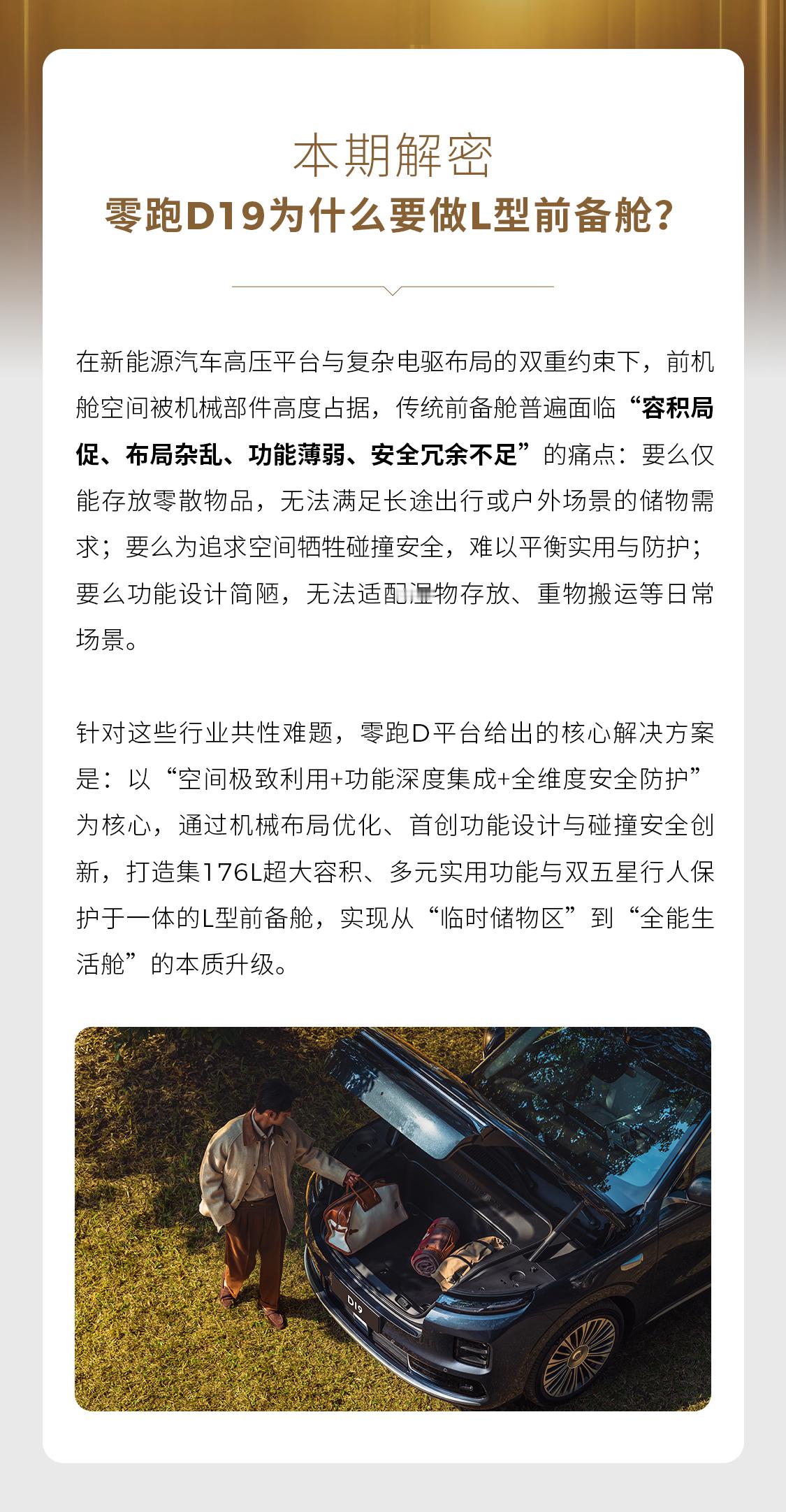 车前的空间,能如何整合?前备舱除了储物还能如何利用?围绕“安全+功能+体验”三大核心,前备舱有哪些不同?零跑旗舰D平台 L型前备舱创新改造,把空间“变魔术”《D100个秘密》专栏第八期:从空间革新到功能集成,看Ta如何实现多场景适配零跑D19零跑汽车