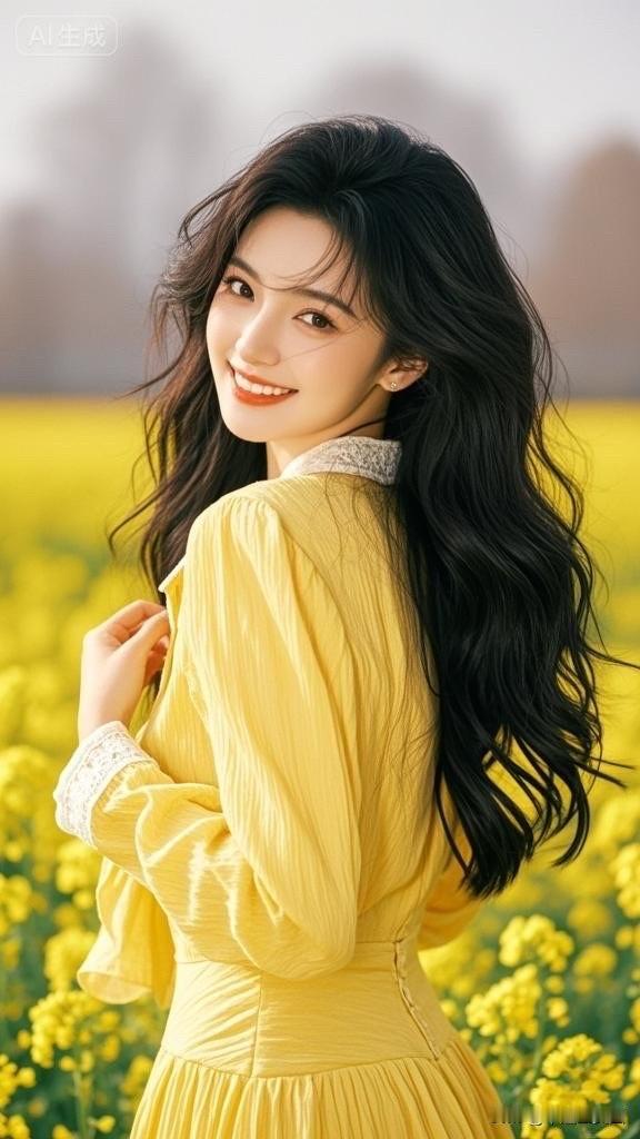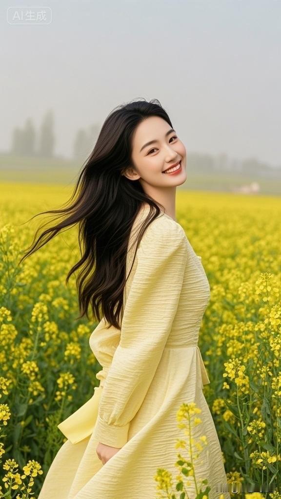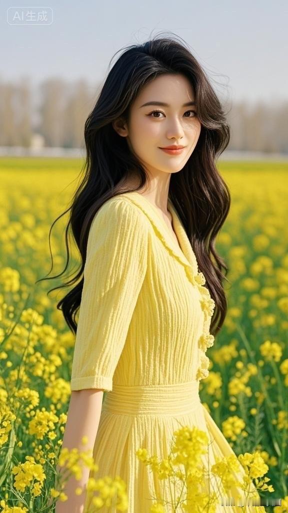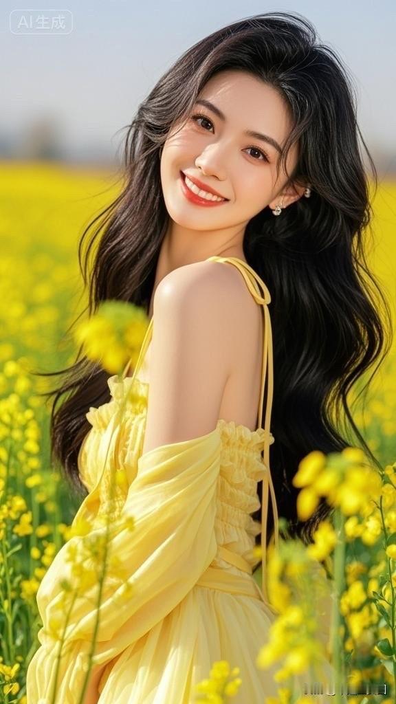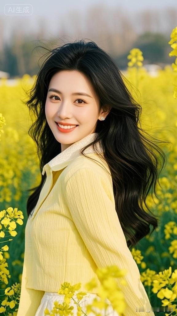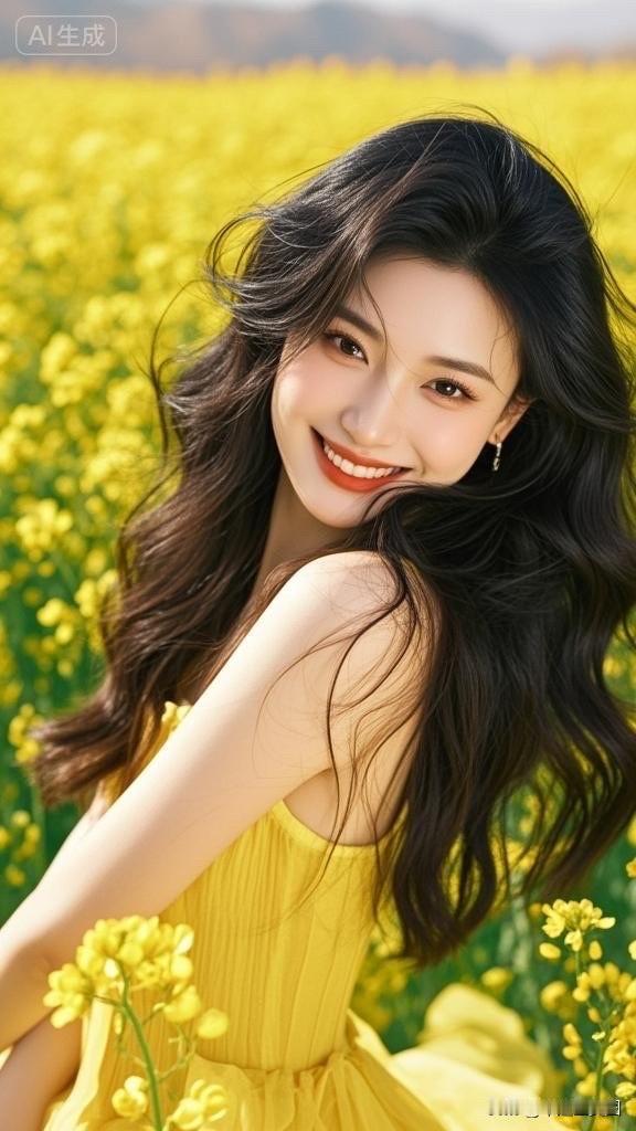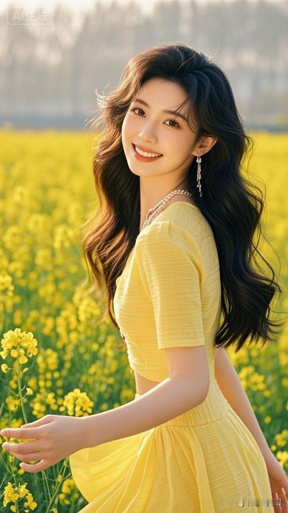 在一片金黄的油菜花田中,笑容灿烂的少女与自然融为一体,仿佛置身于童话世界。