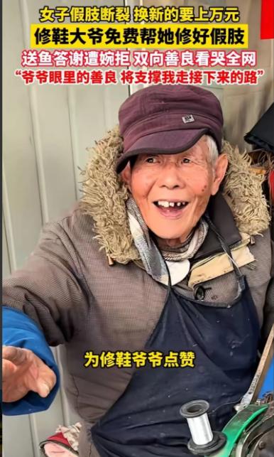 看哭了!江苏,一女子假肢断裂,医生说换新的得1.2万元,女子没钱,就拿着假肢问修鞋大爷能修不?修鞋大爷修了一辈子的鞋,从没修过假肢,但他见女子可怜,还是努力帮她修好了!当女子问大爷需要多少费用时,大爷居然说…… 江苏杨女士(化名)的假肢断裂,给她的生活带来了不小的困扰,她本来就生活拮据,没办法承担新的假肢费用,医院建议她更换一副新假肢,价格高达1.2万元,而她的收入远不足以支撑这样的开支。 对于杨女士来说,这笔费用不仅仅是钱的问题,更是一份沉重的心理负担,她的假肢已经伴随她很多年,曾经给她带来了无数的方便和希望,然而,随着假肢的断裂,杨女士陷入了两难境地,不换,生活质量会大打折扣。 一天杨女士来到镇上的一家修鞋铺,这家店面看起来并不起眼,但修鞋的大爷却有着多年的经验,杨女士走进店里,低声问道,“大爷,能修修这只假肢吗?” 修鞋大爷是个面容慈祥的老人,修鞋的手艺可圈可点,尽管从未修过假肢,老人依然愿意尝试,他看着杨女士那一双略显疲惫的眼睛,心生怜悯。 紧接着修鞋大爷拿起工具,专心致志地开始修理,杨女士看到大爷在店铺内忙碌的身影,心情愈加复杂,假肢对于她来说,不仅仅是一个普通的物件,它是她生活的一部分,是她重新站立、重新获得自由的象征,看着眼前这个陌生的大爷,杨女士心中不禁产生了几分感激。 大爷对假肢进行细致的修补,他拆卸了损坏的部件,逐一检查,最后小心翼翼地将它们重新组装,虽然修鞋和修假肢不同,但大爷凭借着自己多年修理鞋子的经验,在心灵上多了一份耐心与细致,他时不时地停下来,确认每一个细节,生怕因为不小心而导致修复效果不佳,过了近一个小时,假肢终于修好了。 杨女士看着大爷修好的假肢,试着站了起来,感觉居然恢复了原有的功能,虽然不如全新的假肢那样完美,但在短期内完全可以使用,这让杨女士忍不住涌上心头的是一股暖流,她感动得说不出话来。 然而就在杨女士准备拿钱给大爷的时候,大爷却摆了摆手,笑着说道:“不用了,能帮她修好就好”,听到这话,杨女士愣住了,她从未想过会遇到如此无私的大爷,心里满是感动和感激。 杨女士的眼睛湿润了,她觉得,除了物质上的帮助,这份来自陌生人的关怀更是难得。 后来这件事情被网友们看到了之后,有的网友表示,“这位大爷真的是活雷锋,给社会带来了温暖”,还有的网友说,“生活中还有这样的好人,真是让人感到希望。” 对于杨女士而言,修好假肢不过是表象,真正触动她内心的,是修鞋大爷无私的帮助、深沉的关怀,那蕴含其中的大爱之力,如暖流般淌入她的心间。 杨女士心中明白,虽然眼前的困境还没有完全解决,但这份来自社会、来自陌生人的关爱,让她感到自己并不孤单,也让她在生活的艰难中找到了希望。 信息来源:宁波晚报