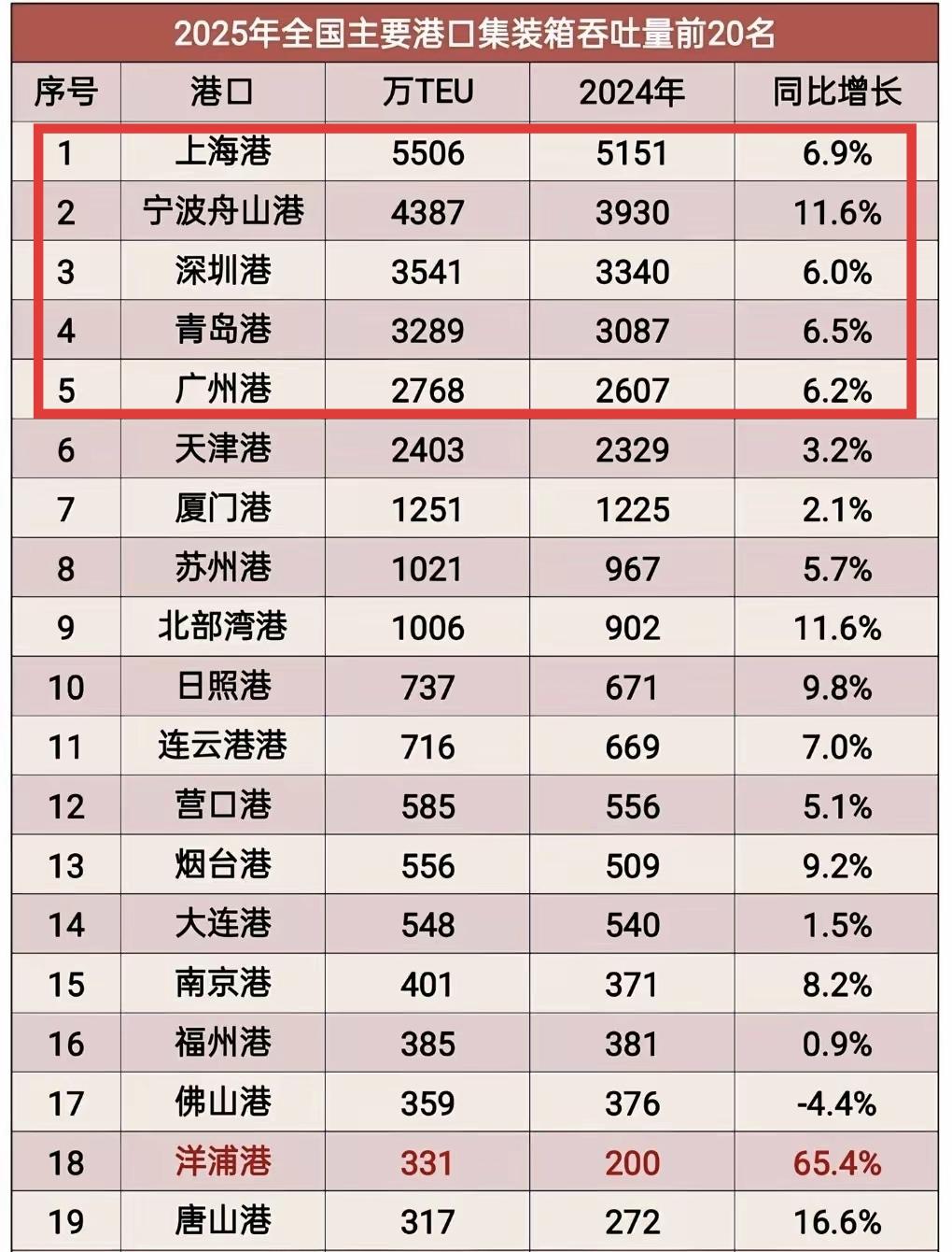 中国2025年吞吐量前五的港口,同时也是世界十大港口。基数都这么高了,五个港口都还能保持百分之6以上的增长,真的太厉害了。其中宁波舟山港更是增长了超百分之11,真的很强啊。值得一提的是南方还有一个港口在崛起,它就是广西北部湾港,增长也很迅猛。