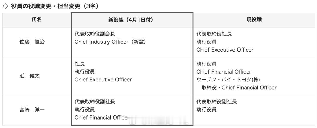 丰田汽车宣布重大高层人事调整。从2026年4月1日起,现任首席财务官(CFO)近健太将接任社长兼CEO,现任CEO佐藤恒治将转任副会长,并兼任新设立的首席行业官(CIO),丰田章男继续担任董事长。