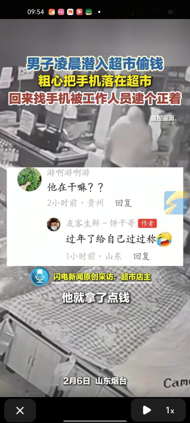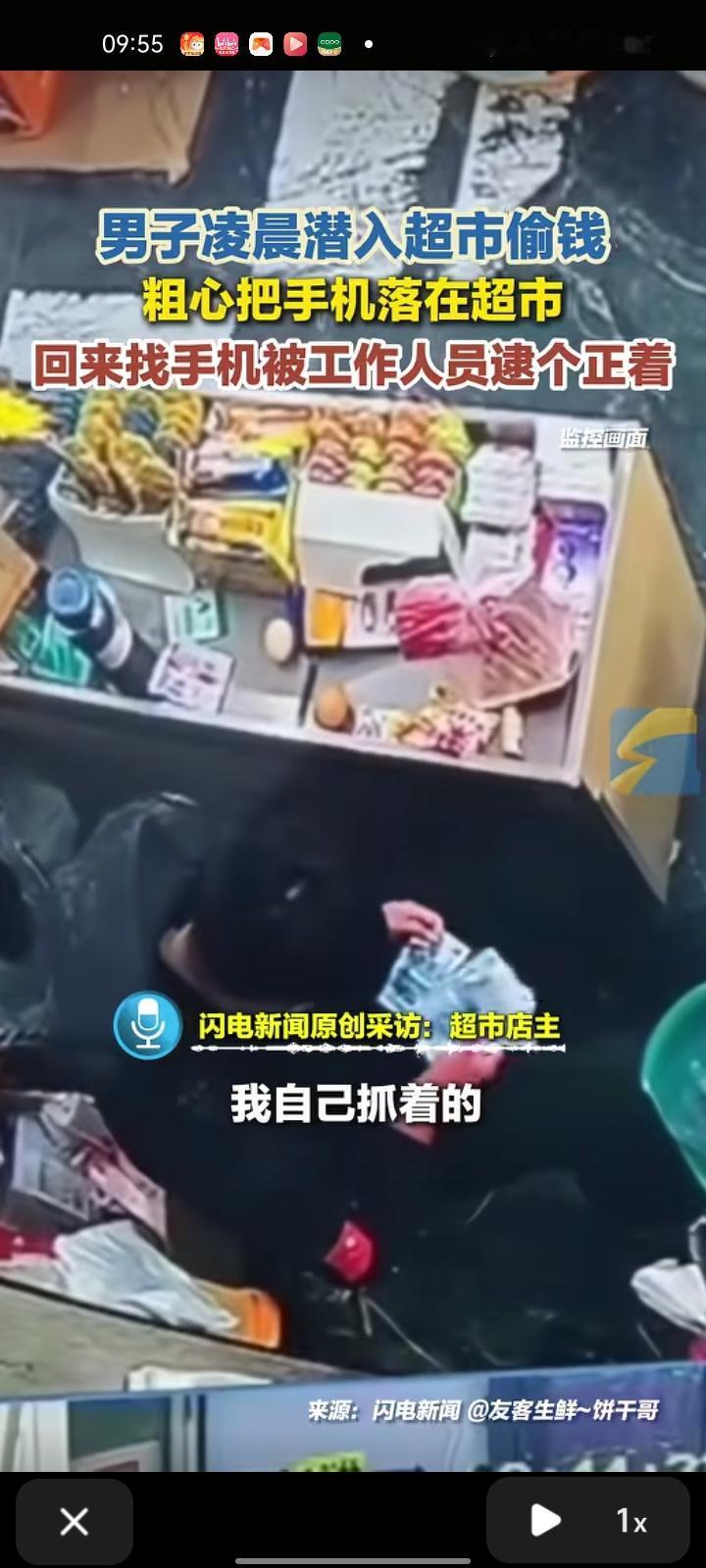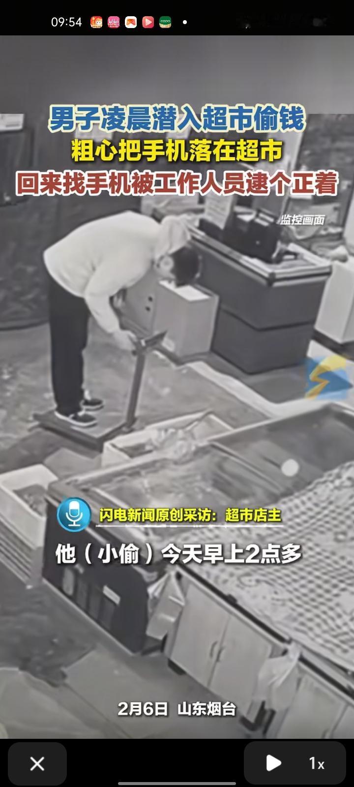 2月6日,烟台莱阳市。超市里来了一个小偷,先站上电子秤称重,随后打开收款机拿钱,离开时把手机落在超市了。第二次小偷又来到收银台偷钱,找手机时被店主抓个正着,目前店主已报警。