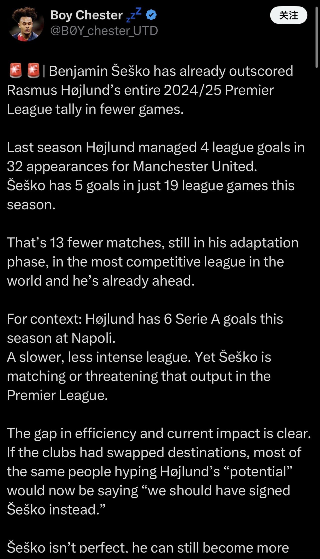 我特意看看了,到底哪个海外媒体写的这个文章还在拿霍伊伦说事。 结果就是个普通球迷,这哥们头像是 齐尔克泽,然后他的文章基本都是批评霍伊伦的[呲牙] 我只想说:霍伊伦 好不好,人家都已经走了,不需要你再批评和评价了。 而你喜欢的齐尔克泽也该滚蛋了。 ……………………………………………………………… 本杰明·舍什科在更少的比赛场次中,进球数已经超过了拉斯穆斯·霍伊伦德在 2024/25 赛季英超联赛的总进球数。 上赛季,霍伊伦德代表曼联出场32次,打入4个联赛进球。 本赛季至今,舍什科在19场联赛中已经打入5球。 这意味着他少打了 13 场比赛,仍然处于适应阶段,而且是在世界上竞争最激烈的联赛中,但他已经领先了。 作为参考:霍伊伦德本赛季在意甲联赛中为那不勒斯打入 6 球。 英超联赛节奏较慢,强度也较低。然而,舍什科在英超联赛中的表现却能与英超联赛相媲美,甚至与之匹敌。 效率和当前影响之间的差距很明显。 如果两家俱乐部互换了目的地,那么现在吹捧霍伊伦德“潜力”的大多数人都会说“我们应该签下谢什科”。 舍什科并不完美,随着他逐渐适应英超联赛的要求,他仍然可以变得更加冷静和身体强壮,但他的基础已经比许多人预期的要好得多。 是时候停止固守过时的观念了。 谢什科现在的表现证明,他是更佳的选择。 我们准备好承认这一点了吗?