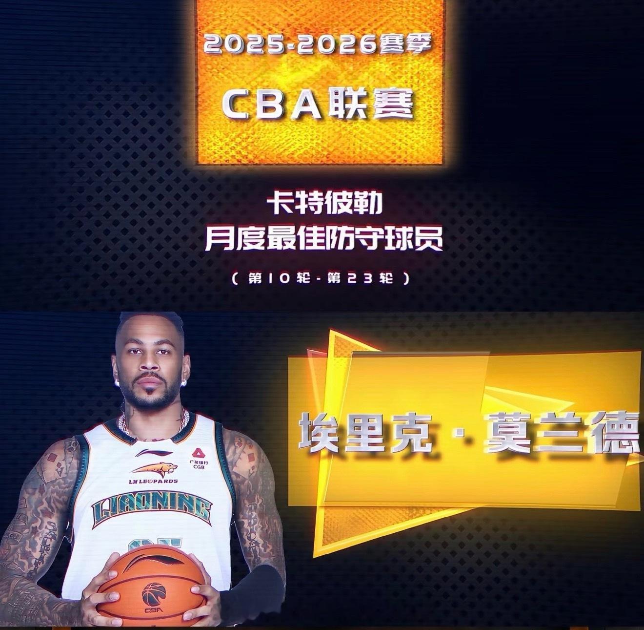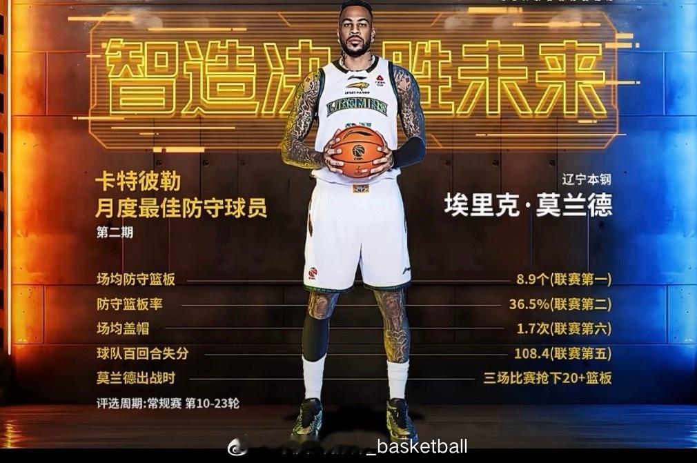 辽宁男篮外援莫兰德获得CBA官方评选的月度最佳防守队员,他在过去13轮比赛拿到了联盟最多的8.9个防守篮板