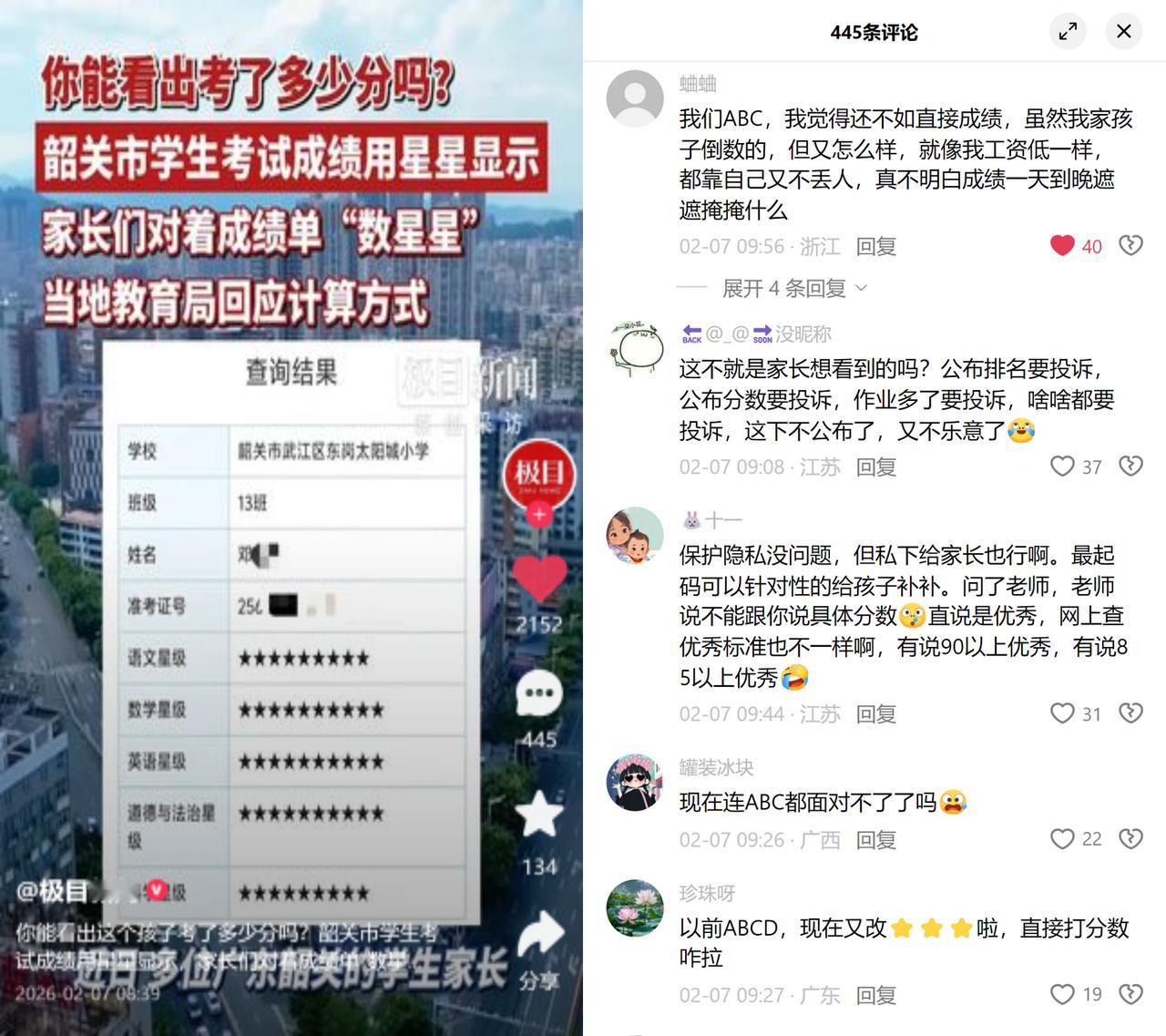 家长集体数星星猜分数 韶关不少中小学期末成绩单,全是星星没分数,也没换算标准。家长对着9星10星犯愁,问老师只模糊说优秀,连到底是90还是95都摸不清,相关单位回应这是合规的等级评价方式。 这事儿看似折腾,背后反映的却是教育改革里的老矛盾:政策要打破唯分数论,用等级、星星弱化竞争焦虑;可家长面对的是中考实打实的分数录取,信息不透明,连孩子哪科薄弱都没法精准补。 家长之所以揪着分数不放,主要是想心里有数才能帮到孩子。顶层设计的理想态,遇上基层需求的现实感,中间的模糊地带就成了尴尬的真空。遮遮掩掩的星星没减多少焦虑,反倒添了新的糊涂。 什么时候能找到既不唯分数,又能让家长踏实的平衡点?