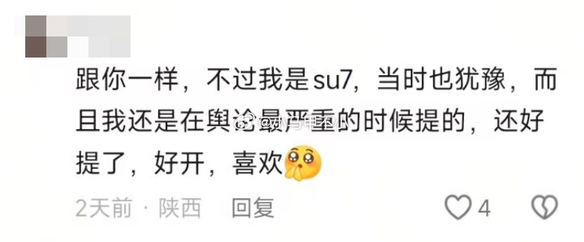 跟你一样,不过我是 su7,当时也犹豫,而且我还是在舆论最严重的时候提的,还好提了,好开,喜欢