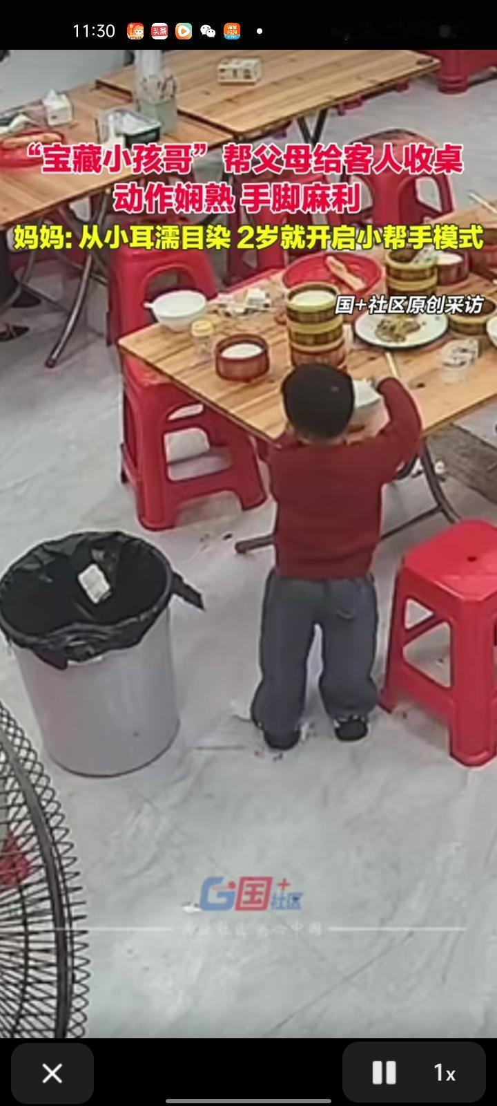 2月4日,揭阳普宁市。“宝藏小孩哥”帮父母给客人收桌,动作娴熟,手脚麻利 孩子妈妈表示,孩子两岁多就特别懂事,帮家里收拾桌子。店员忙不过来时,他会主动上前搭把手端碗筷、收餐盘,收拾完还会拿抹布把桌子擦的干干净净,一套动作行云流水,一条龙服务做得有模有样
