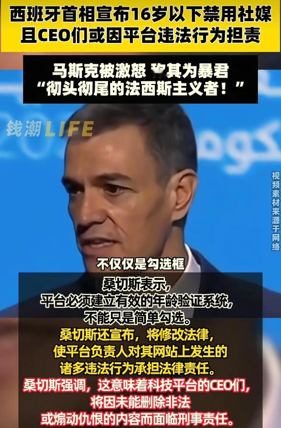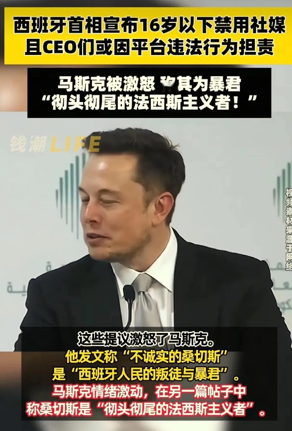世界首富马斯克又爆粗口了。这一波 我占桑切斯。马斯克公开辱骂西班牙首相桑切斯。说他是彻头彻尾的法西斯主义者。 原因是桑切斯宣布16岁以下的孩子禁用社交媒体账号。原本这是一个很好的提议,来作为崇尚自由的马斯克觉得他这样是剥夺了人权。 一直觉得马斯克情绪很稳定,没想到骂起人来毫不留情。