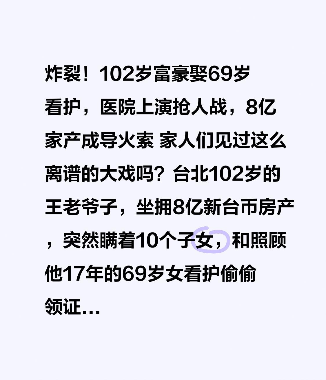 炸裂!102岁富豪娶69岁看护,医院上演抢人战,8亿家产成导火索 家人们见过这么离谱的大戏吗?台北102岁的王老爷子,坐拥8亿新台币房产,突然瞒着10个子女,和照顾他17年的69岁女看护偷偷领证结婚!更刺激的是,双方在医院直接上演“抢人战”,子女组团埋伏抢轮椅,看护一路狂追拉扯,这场闹剧的背后,全是钱的味道! 这事得从2009年说起,赖姓看护开始照顾王老爷子,老爷子对她十分信任,这些年陆续送了她和她子女7间房、7笔土地,市值都快2亿新台币了。子女们虽然心里不舒服,但想着是父亲的心意,也没过多阻拦。可谁也没想到,今年1月5号,赖看护竟然带着老爷子悄悄办了结婚登记,10个子女全被蒙在鼓里,等知道的时候,木已成舟! 矛盾彻底爆发在2月3号的医院!赖看护推着老爷子去马偕医院复诊取药,刚走到侧门,3个儿子、3个媳妇、4个孙子突然从旁边冲出来,一把抢走轮椅,推着老爷子就往计程车上塞,想赶紧把人带走。赖看护急得直跺脚,一路狂追还和对方拉扯,现场又吵又闹,路过的病人和家属都看呆了,这哪是探病,简直是警匪片现场! 本以为只是简单的家庭纠纷,没想到转折点来了——这“抢人战”根本不只是争抚养权,更是为了8亿家产!子女们怒控赖看护是“骗婚”,说老爷子年事已高,可能神志不清,被看护操控了,就是想霸占所有房产和土地。可赖看护反驳说,结婚是老爷子主动提的,两人有感情,而且办理登记时,老爷子意识清楚,能正常回答问题,户政人员依法受理,程序没问题。 更有意思的是律师的质疑:户政人员面对相差40岁的高龄组合,真的尽到审查义务了吗?结婚需要两名证人,这两位证人难道没觉得不对劲?现在子女们正在加急走监护宣告程序,想证明老爷子是限制民事行为能力人,从而推翻婚姻效力,可赖看护已经是合法妻子,未来在财产继承上占尽优势,这8亿家产大概率要被分走一半! 其实这事儿不是个例!辽宁就有九旬老人,在养母去世当天和小38岁的保姆领证,死后房产、丧葬费全被保姆儿子拿走,养女打官司都败诉了。法院说只要结婚程序合法,老人能表达真实意愿,婚姻就有效,哪怕年龄相差悬殊。这也给所有子女提了个醒:高龄老人的婚姻和财产,真的不能掉以轻心! 网友们吵翻了天,有人说“看护照顾17年,结婚分家产也合理”,也有人骂“明摆着就是图钱,趁老人糊涂下手”。但抛开争议,最让人唏嘘的是:102岁的老爷子,本该安享晚年,却成了双方争夺财产的“筹码”。子女们平时忙着自己的生活,把照顾父亲的责任交给看护,等到财产要被分走,才急着抢人,早干嘛去了? 而这场医院抢人战,也暴露了高龄老人的尴尬处境。现在很多高龄患者就医时,因为医疗风险高、医保控费等原因,还会被科室“推来推去”,可王老爷子却因为有钱,成了“香饽饽”,被双方拼命争抢,这对比简直讽刺! 说到底,这事儿戳中了大家的痛点:当亲情遇上巨额财产,人性的贪婪就暴露无遗。17年的照顾,到底是真情还是算计?10个子女的争抢,到底是尽孝还是图财?或许只有当事人自己清楚。但不管怎样,高龄老人的意愿应该被尊重,同时也该有完善的机制,防止有人趁虚而入,侵犯老人的合法权益。 你觉得这是真爱还是骗婚?子女和看护谁更有理?评论区聊聊你的看法,点赞转发,提醒身边有高龄老人的家庭:提前做好财产规划和监护安排,别等出事了才追悔莫及,别让亲情最终输给了金钱!