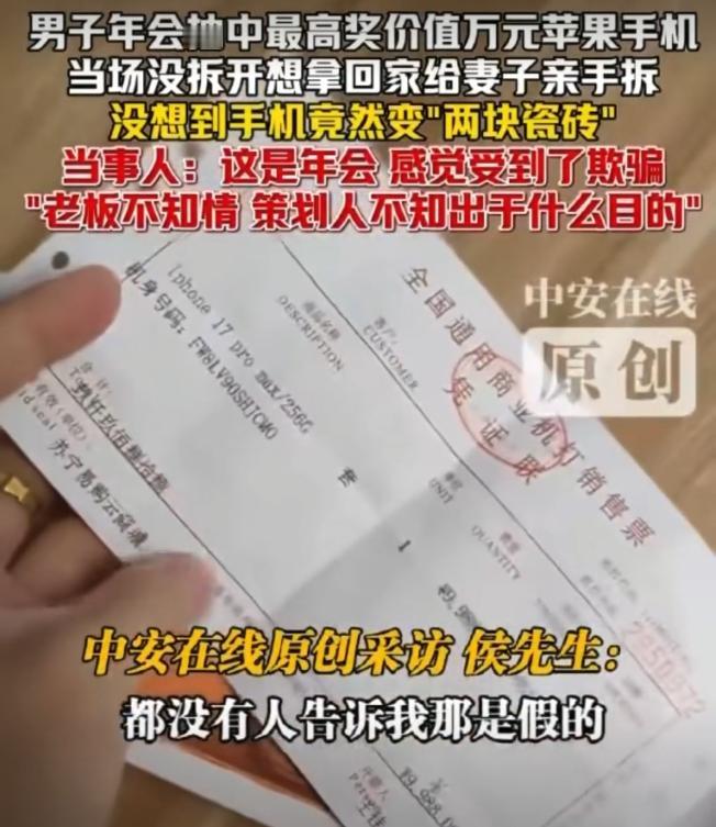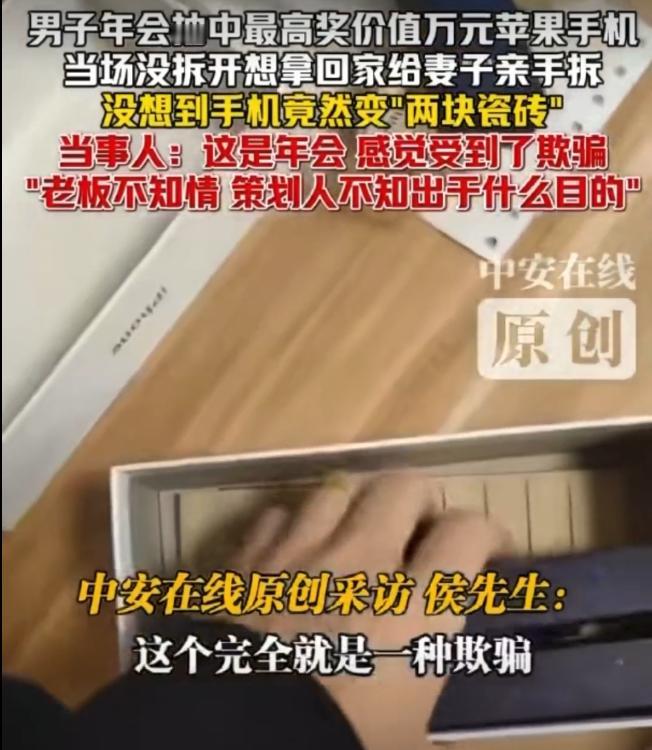 “拿我当猴耍?”广东珠海,一男子在年会上抽中了一部价值9988元的手机。谁知当妻子拆开手机盒后,却发现里面只两块瓷钻,这可把男子气坏了,指责公司玩不起。但老板感到十分委屈,称自己也不知情,是策划搞的。男子得知后,表示策划必须道歉。可万万没想到,策划作出的最新回应,让男子彻底坐不住了。 事情最后的处理,其实还是靠协商来的。男子和策划人商量了一下,定在2月10日那个更大型的年会上,让策划人当众鞠躬道歉。这个结局出来后,网上的议论可火爆了。有网友说你这是跟领导较真,自己以后怎么混,还有人直接追问,咋能不要手机只要道歉?道歉又不值钱。更有人怀疑手机发票都开了,是不是被策划给拿走了。这种年会上抽奖,谁惨遇过?大家要是碰上了,会做什么样的选择? 从法律层面捋一捋,要说抽奖,性质上有点像买彩票。公司说了奖品是苹果手机,那无论如何,就应该发给中奖人。年会抽奖这种事儿,形式上也是公司给员工发福利,按规矩走就是得兑现承诺,不可能用两块瓷砖忽悠过去。《民法典》第7条写得清清楚楚,做什么事得讲诚信,答应别人的事得办到。公司要是借着整蛊的名义把手机变成瓷砖,不补给获奖人,这就属于不守信。 再说要不要道歉的问题,涉及到人格权。一般来说,如果给人带来极大羞辱,或者诚心怼某人闹出很大影响,那真可以要求对方道歉。法律对这一块也有规定,谁的人格权被踩了,可以要求道歉,且不存在诉讼时效问题。这个策划的本意不是专门针对这位中奖员工,说穿了,跟愚人节糊弄人差不多,闹得不过分大多就算了。不过被整蛊的人心里总归还是不好受。 策划之后也终于露面了,他倒是直说不是故意针对某个人。抽奖就给设置了个“暗雷”,目的就是逗闹下年会,看看谁最倒霉。凑巧这倒霉事就落公司自个儿员工头上了。虽说自己是男子的科室主任,但男子很明确,手机不要了,可道歉必须得有。 老板起初一听也愣住了,说真的自己也懵圈,因为特等奖那可是自己亲自颁的啊。但手机拆箱视频都在那摆着,事实无法赖掉。老板马上甩锅,说全是策划整的,自己压根不知道。男子觉得老板没兴趣干这种低级恶作剧,所以认定就是策划背后捣鬼。他压着火瞪着要策划出来说话,因为觉得这事太过分。 拆开手机的事是在年会后才发生的。男子当时拿回去没急着开,是打算让老婆亲手拆箱。毕竟媳妇听说老公给自己中了一部新手机,心里别提多甜了,磕磕碰碰之后却发现盒里全是瓷砖,懵了。两口子顿时一堆问号,手机丢哪了?第一时间就找公司质问去了。 整个过程其实挺普通,大年三的晚上,珠海某公司年会,提前公告了今年抽奖奖品,顶尖奖项是9988元的256G苹果17pro,抽到这个头彩,谁不羡慕啊。男子原本也没太大期待,就图参与。到最后一轮开奖,大家屏幕上都在等特等奖号出现,主持人一揭晓,结果正好就是他。这下子情绪直接拉满,领奖还是老板亲自递的盒子,激动得不行。 满心欢喜带回家一拆,直接悲催。这个年会,也算让这对夫妻永生难忘了。