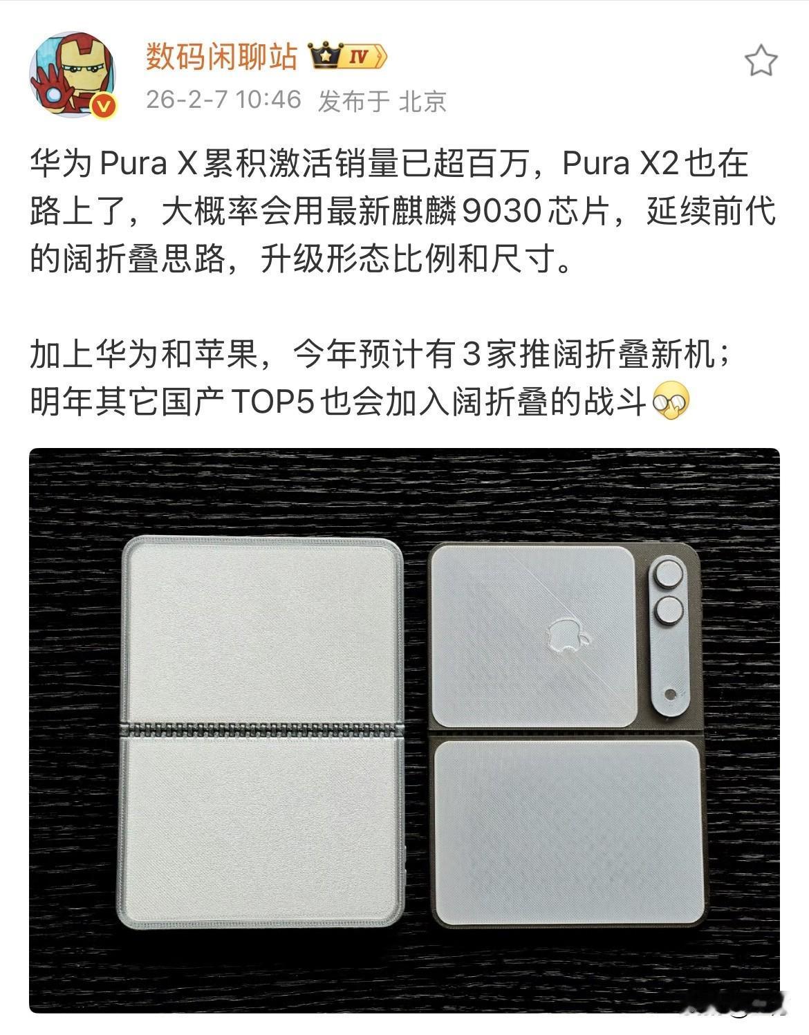 华为Pura X累积激活销量已超百万! 就是刚才,有数码博主放出了华为Pura X系列最新的激活量,由于他的下一代产品马上就要出来了 ,所以这个机子的激活量出来之后,很多人还是感觉在意料之外! 因为这个机型一开始出来的时候并不被行业看好,但是没想到越来越好,所以很多同行也开始出这个系列,因为在这之前可能很多人都没有听说过一个比较出名的阔折叠手机 华为把这个细分领域做出成绩之后,许多同行才发现,这也是个机会。 但能不能够跟得上就不好说了,毕竟华为下一代的Purax2,可能会在之前的基础上再升级,在核心的处理器方面,有可能会麒麟9030芯片,而且可能会把相应的形态和比例尺寸做得更加的大。 看看到时候会不会有同行继续跟上,毕竟这种款式的手机开发产品还是比较大的,如果品牌力度不够,或者产品本身做得不够有竞争力,还是很难在市场上立足的。