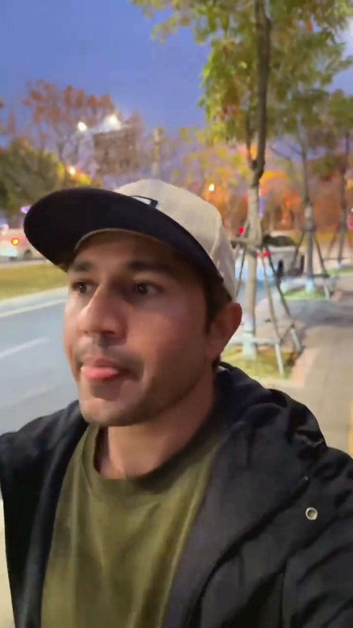 这就是我们在中国的这座城市,你们看看这个,这是这里超壮观的夜晚景色。快看这里,还有这些树木,这就是中国的树木,色彩太丰富了。看看这个,我正走在中国的一座城市里,这是夜晚散步时的景象。看看这座城市,快看,你甚至无法想象这到底是城市还是森林,还是说我走在丛林里,你根本想不到,完全看不到普通的住宅,也看不到商铺,满眼都是美景,郁郁葱葱的绿植,色彩缤纷的树木。朋友们,我的天呐!