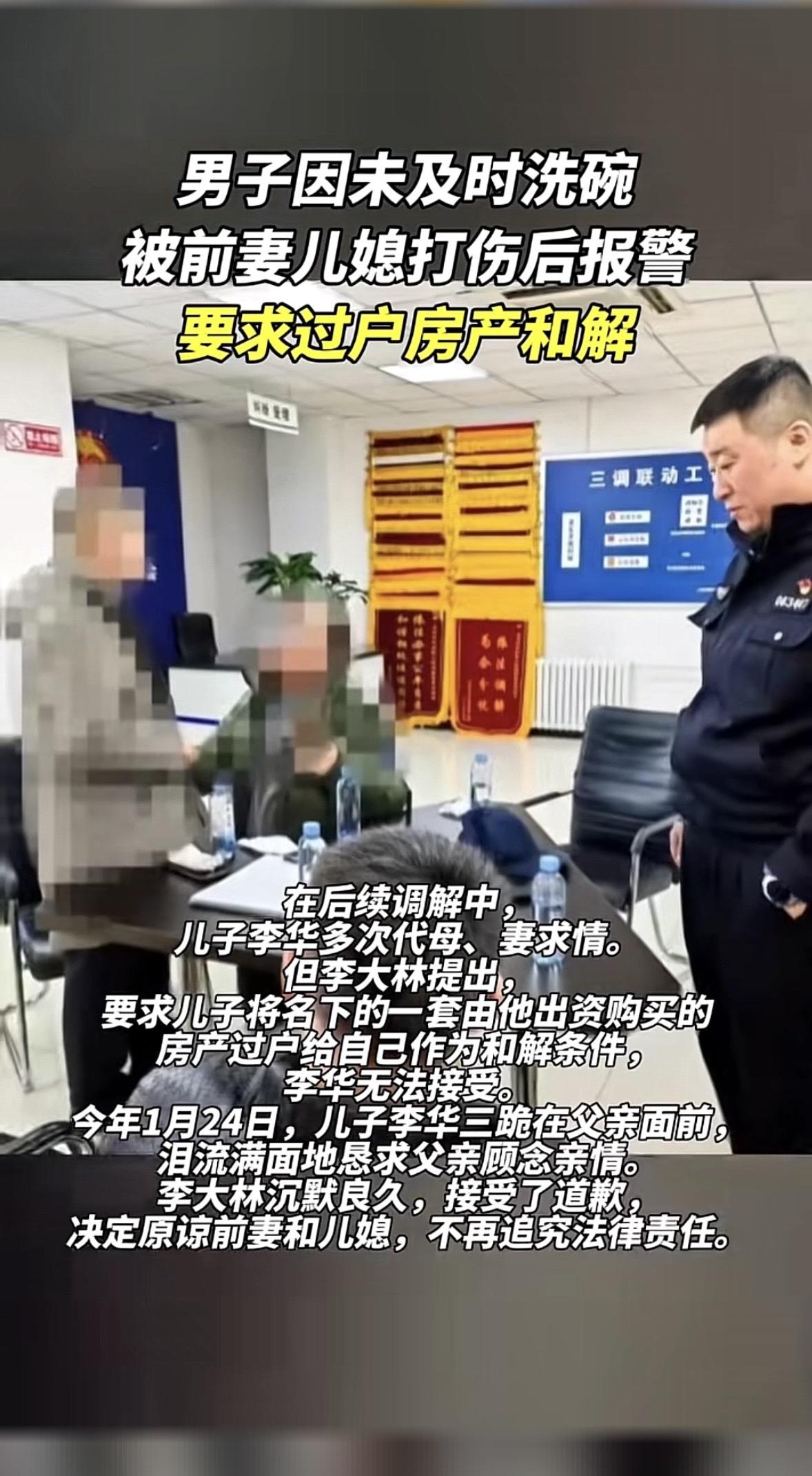 “太狗血!”黑龙江大庆,男子和前妻离婚15年,为了帮带孙子,俩人仍住一起,谁料,就因为男子酒后没及时洗碗,竟被前妻和儿媳又骂又打,男子挂了彩,气得直接报警,要追究2人的责任,儿子坐不住了,求他高抬贵手,放过母亲和妻子,男子却提出条件,要求儿子把名下唯一一套房子过户给他,儿子不同意,给男子下跪3次求原谅。结局亮了。 李大林和前妻王丽离婚都15年了,虽然法律上不是夫妻,但俩人还一直搭伙住在一个屋檐下,主要是为了帮着儿子李华带孙子。 这种离婚不离家的日子,本来就像走钢丝,稍微有点风吹草动就容易失衡。 2025年12月的一天晚上,李大林喝了点酒,脑袋晕乎乎的,吃完饭把碗一推,没像往常一样马上收拾去厨房洗。 儿媳妇看不顺眼了,嘴里开始碎碎念,话赶话地数落老公公懒。 王丽一听儿媳妇受委屈,护犊子的劲儿立马就上来了,跟着一起指责李大林。 李大林本来就喝了酒,脾气冲,觉得自己虽然是前夫,但好歹也是长辈,出钱养着这一大家子,现在连个碗都不能歇会儿再洗? 借着酒劲,他跟王丽和儿媳妇吵了起来,吵着吵着双方就动了手。 撕扯之间,李大林挂了彩,身上被王丽和儿媳妇抓了好几道印子。 这一架打完,李大林心里的火不但没消,反而越烧越旺。 他觉得自己吃了大亏,一气之下直接报了警,还放了狠话,说这事儿没完,必须拘留她们! 进了派出所,调解是少不了的。儿子李华夹在中间,真是两头受气,里外不是人。 一边是亲妈和媳妇,一边是亲爹,哪边他都得罪不起。 李华硬着头皮,一次次替妈和媳妇给爹赔不是,说好话都要把嘴皮子磨破了。 可李大林正在气头上,根本听不进去。他心想,我不能白挨打,也不能白受这气。 他眼珠子一瞪,冲着儿子李华提出了一个让所有人都傻眼的条件:想让我原谅她们?行,把你名下那套房子过户给我。那房子当初是我出钱买的,归我不过分吧? 这话一出,李华脸都白了。 那套房子虽然是老爹出的首付,但早就过户到自己名下了,现在市价也不低,而且是一家人住的地方。 把房子给了爹,自己一家老小住哪?再说,这也不是一笔小数目。 李华觉得老爹这是在趁火打劫,根本没法接受,调解一下子就僵住了。 时间拖到了1月24号,眼看这事就要往法院走,李华是真急了。他知道老爹的脾气,吃软不吃硬。 当天,李华心一横,直接跪在了李大林面前。这一跪,把李大林也给跪懵了。 李华1米8的大个子,跪在地上痛哭流涕,眼泪鼻涕流了一脸,一边磕头一边求爹,说爸,我就这一套房,给了你我们住哪啊? 看在我是您亲儿子的份上,看在孙子还得上学的份上,你就高抬贵手吧!我给你养老,以后啥都听您的还不行吗? 看着儿子这副模样,李大林原本坚硬的心,像是被什么东西狠狠撞了一下。他沉默了好久,屋子里静得只能听见儿子的抽泣声。 李大林心里也在翻腾。真要把前妻和儿媳送进去拘留,这个家就彻底散了。真要逼儿子卖房,儿子这辈子估计都要恨自己。 良久,李大林叹了一口长气,那是把心里的憋屈都吐出来的一声叹息。他看着跪在地上的儿子,心里的防线终于崩了。 他摆了摆手,说算了,这事儿我不追究了。房我也不要了,起来吧。 这场因为酒后没洗碗引发的闹剧,就这样在儿子的一跪中收场了。 李大林放弃了追责,也没再提房子的事。虽然表面上风平浪静了,但谁都知道,这道裂痕已经产生了。 李大林心里明白,这原谅不是因为心里的气真消了,而是因为血缘这根线,剪不断,理还乱。 他选择了亲情让步,哪怕自己受了委屈。而李华虽然保住了房子和妈,但那一跪,也跪掉了作为儿子的不少尊严。 同一屋檐下,锅碗瓢盆的琐事最容易引爆积怨。一旦撕破脸,再想补回去,就得付出代价。 这次是用下跪换来了和解,要是下次再有冲突,还能拿什么来换和平呢? 清官难断家务事,家家有本难念的经,且行且珍惜吧。 那从法律角度怎么看这事? 《治安管理处罚法》第9条规定:对于因民间纠纷引起的打架斗殴或者损毁他人财物等违反治安管理行为,情节较轻的,公安机关可以调解处理。经公安机关调解,当事人达成协议,并履行的,不予处罚。经调解未达成协议或者达成协议后不履行的,公安机关应当依照本法的规定对违反治安管理行为人给予处罚,并告知当事人可以就民事争议依法向人民法院提起民事诉讼。 李大林与前妻、儿媳因家务琐事发生撕扯并受伤,属于典型的“民间纠纷引起的打架斗殴”。 如果李大林伤情没有达刑事立案标准,也就是轻伤以上,此事属于治安管理范畴。 根据法条,公安机关有权且应当优先进行调解。 这个法条也赋予了被侵害人李大林在调解中的主导权:他有权选择是否谅解,也有权提出和解条件,比如要求房产过户。 对此,你怎么看? 关注@运良说法 学法律知识不迷路
