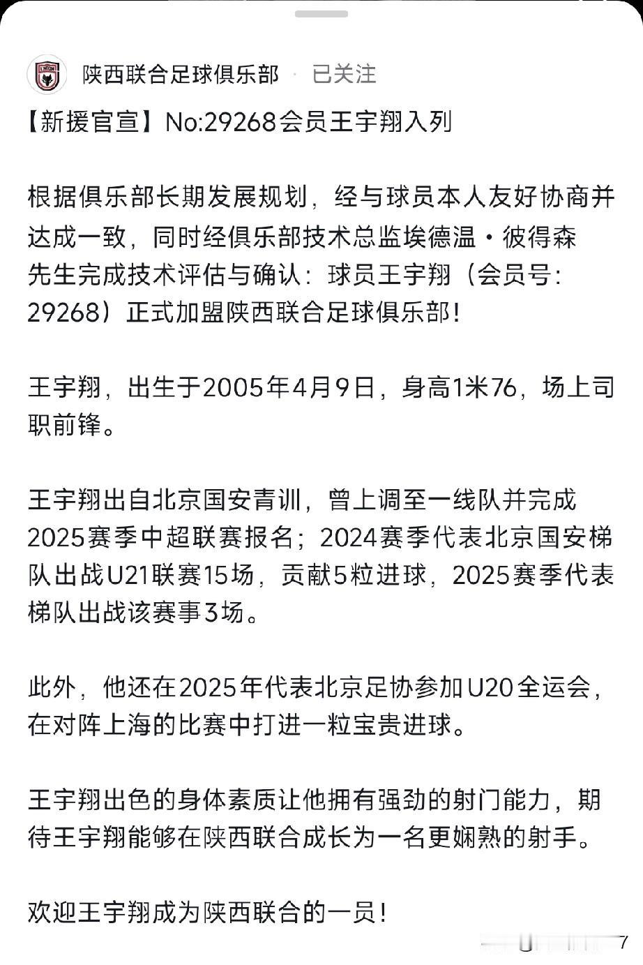 西北狼陕西联合俱乐部又有新动作,官宣北京国安的年轻前锋王宇翔加盟。这个20岁的小